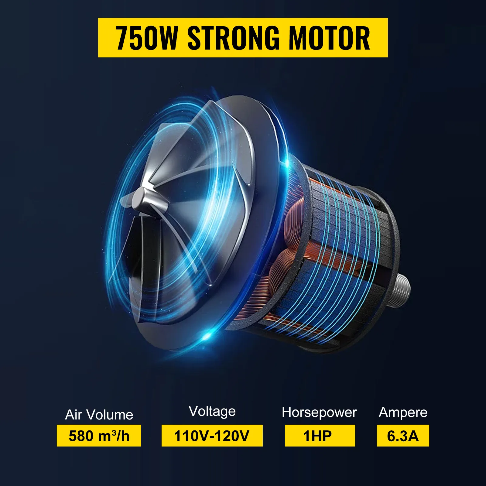 Caballos de fuerza: 1HP. Nuestro soplador de aire de alta calidad posee un motor de 750 vatios de larga duración, que proporciona una poderosa fuerza motriz para inflar artículos. Velocidad de rotación: 3400 RPM. El volumen de aire es de 580 m³/h, y se llena y hace fluir rápidamente el aire para reducir el consumo de energía.