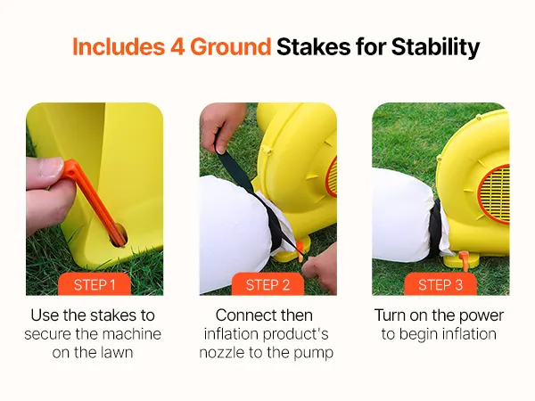 The blower comes with 4 ground stakes, allowing you to secure it even on uneven grass. This ensures the blower stays stable during operation without wobbling or tipping over.