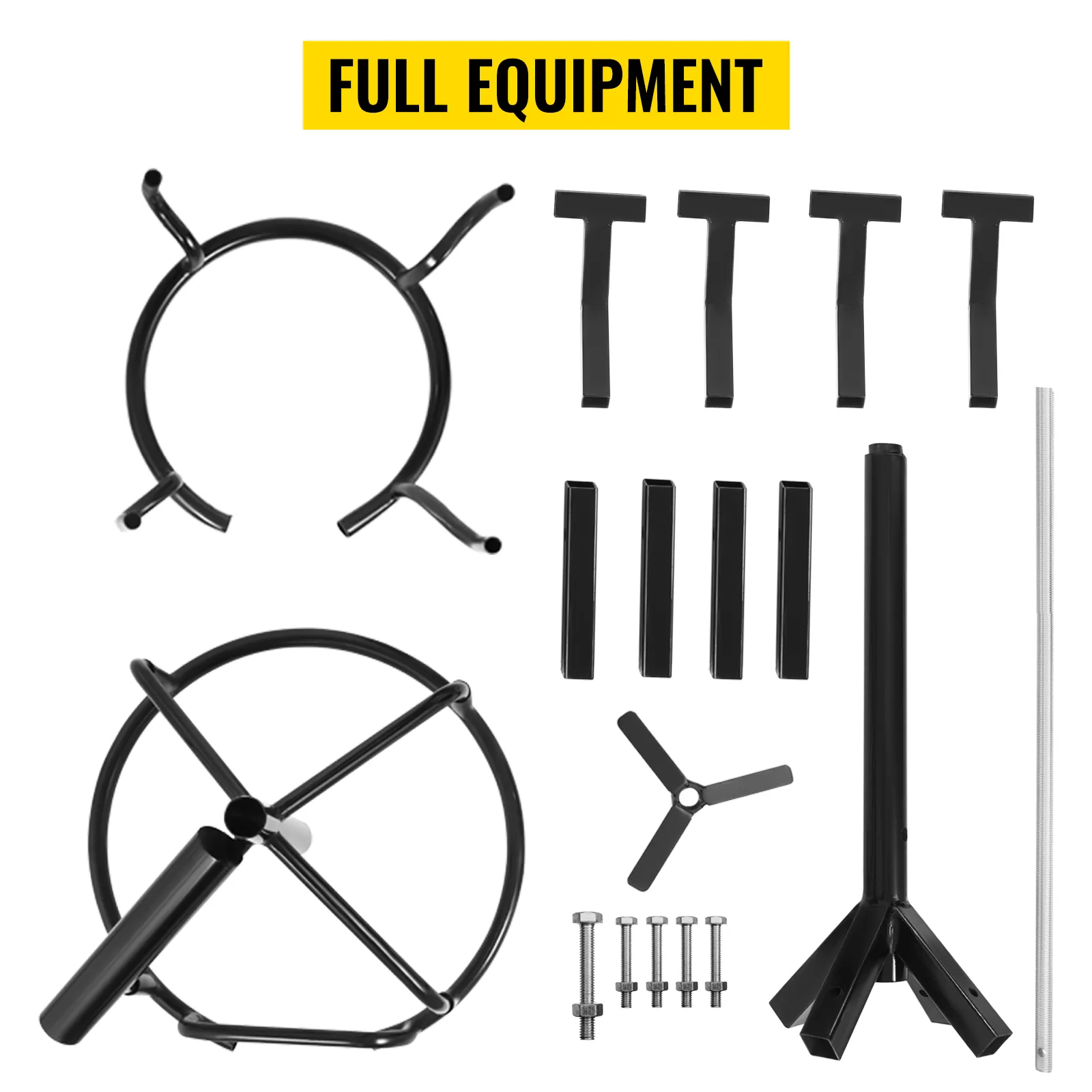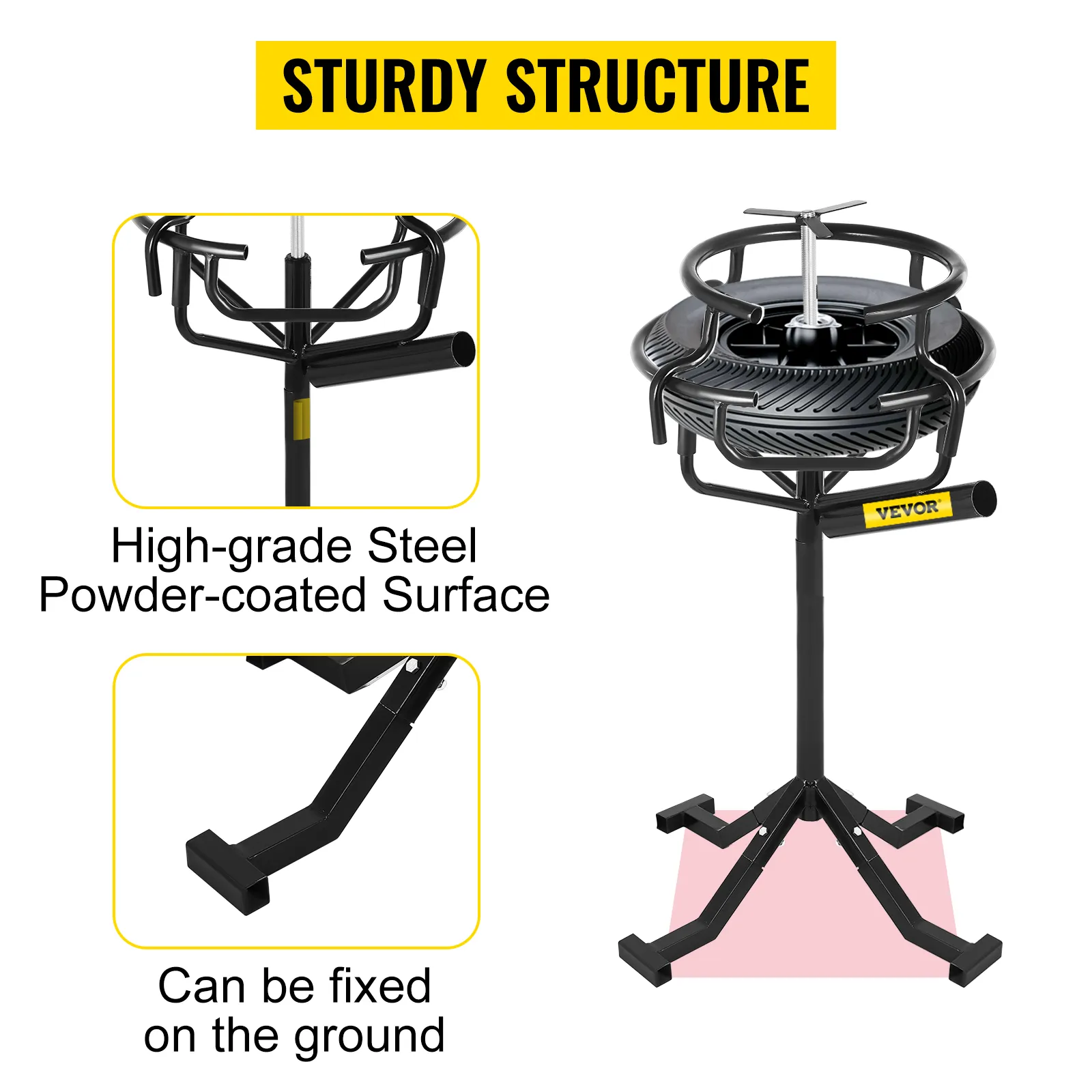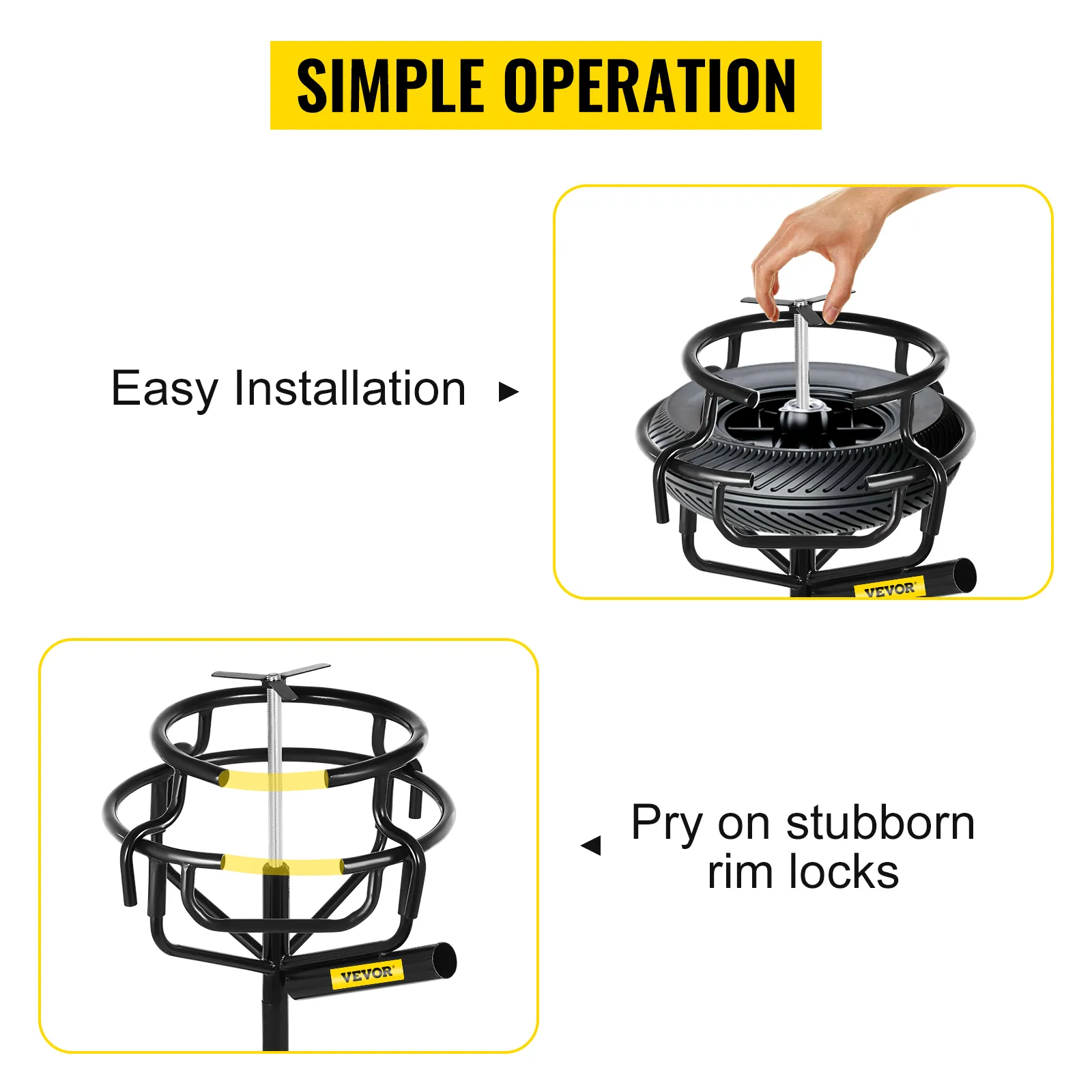 El soporte para cambio de neumáticos cuenta con bases de 20" y 15" para ruedas de diferentes tamaños y espacios de bloqueo de llanta para aflojar los bloqueos de llanta rebeldes. El espárrago del eje con muescas y el anillo recubierto de goma sujetan la llanta firmemente.
