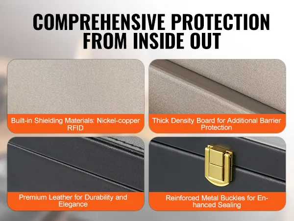Nuestra jaula de Faraday está hecha de material de cuero de alta calidad, el interior está multibloqueado por RFID de níquel-cobre y tablero de densidad, lo que garantiza un mejor efecto de bloqueo de información y también asegura que la caja de protección en sí sea exquisita y duradera.