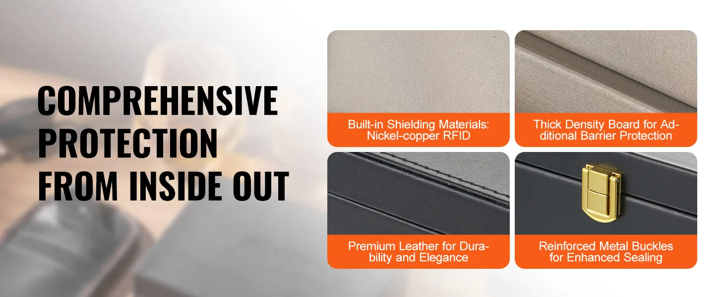 Potente capacidad de protección: esta jaula de Faraday utiliza varios materiales especiales para bloquear mejor la señal y evitar que sea robada. Después de la prueba, nuestros productos están hechos de cuero PU de alta calidad, bajo la apariencia exquisita y duradera, la capa interna está hecha de material de protección de doble capa de alta calidad: tablero de densidad y RFID de níquel-cobre, y sello de bloqueo de hebilla de metal, el efecto de protección de la señal es casi perfecto, lo que puede bloquear eficazmente todo tipo de señales dentro y fuera de la caja. Nota: ¡Para garantizar el efecto de bloqueo de la señal, cierre la tapa!