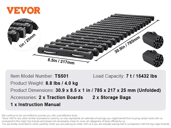 Capacidad de carga de 7 toneladas: con una capacidad de carga máxima de hasta 7 toneladas (15,432 libras), las tablas de tracción pueden soportar una variedad de vehículos, incluidos SUV, vehículos recreativos, automóviles y camiones. Con las tablas también se pueden rescatar rápidamente vehículos grandes.