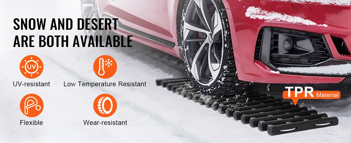 El material TPR de las tablas de tracción prospera en entornos de alta y baja temperatura, manteniendo la flexibilidad y la resistencia para soportar el peso del vehículo y la fricción de los neumáticos.
