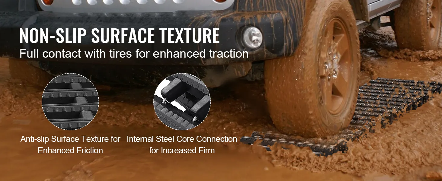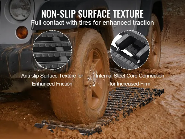 Antideslizante y resistente: la superficie presenta una textura antideslizante, lo que garantiza un contacto total entre los neumáticos y las alfombrillas de tracción de recuperación para evitar resbalones y desalineaciones. La conexión interna del núcleo de acero mejora la durabilidad, evitando roturas o desmontaje y proporcionando una tracción más fuerte.