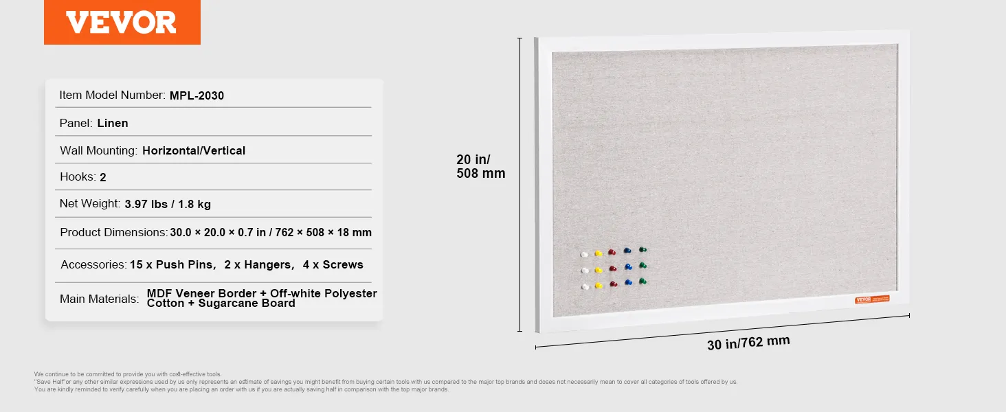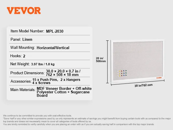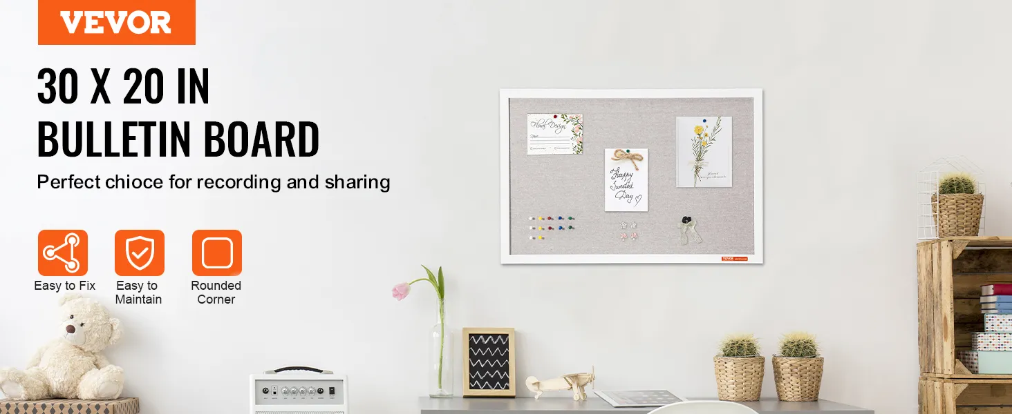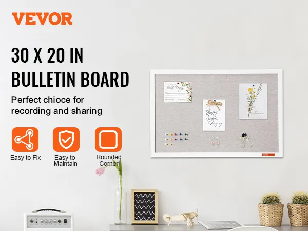 Tablero de corcho blanco VEVOR de 76 x 50 cm con superficie de lino: elegante tablón de anuncios de pared para el hogar, la escuela y la oficina. Tablón de anuncios elegante y funcional.