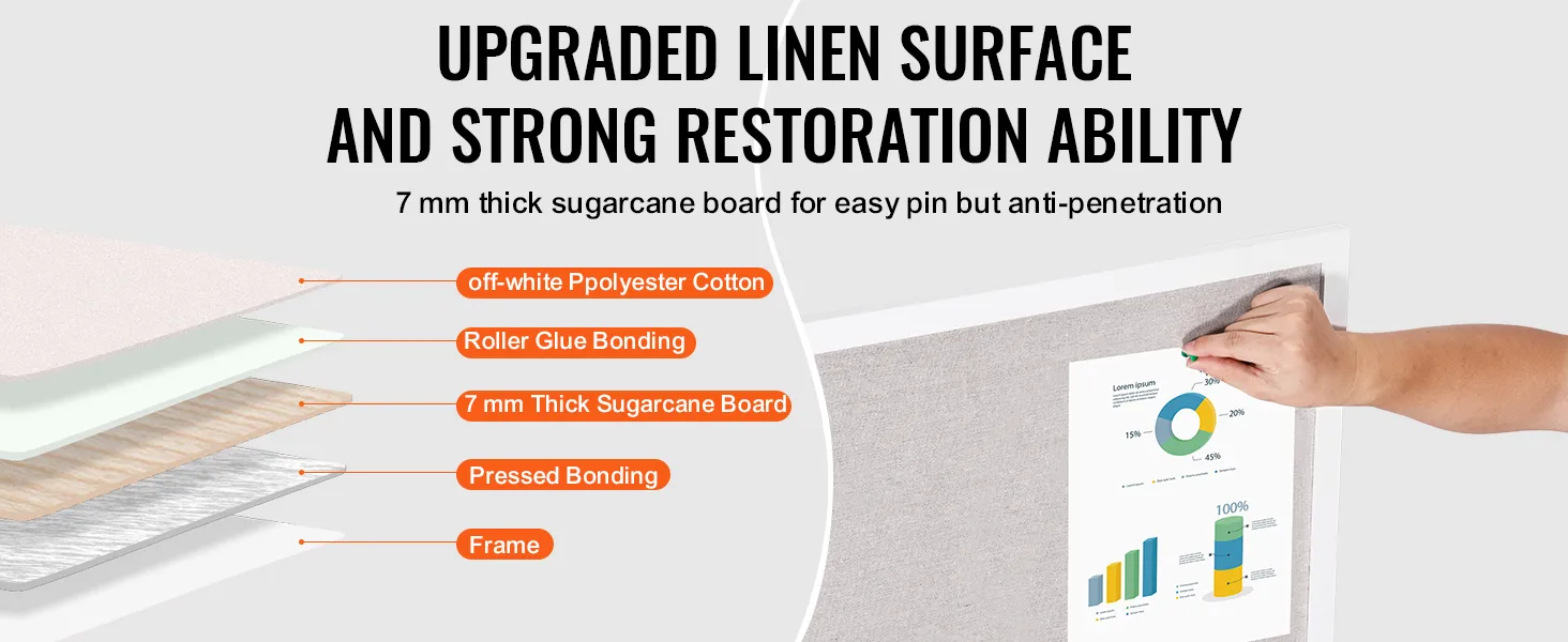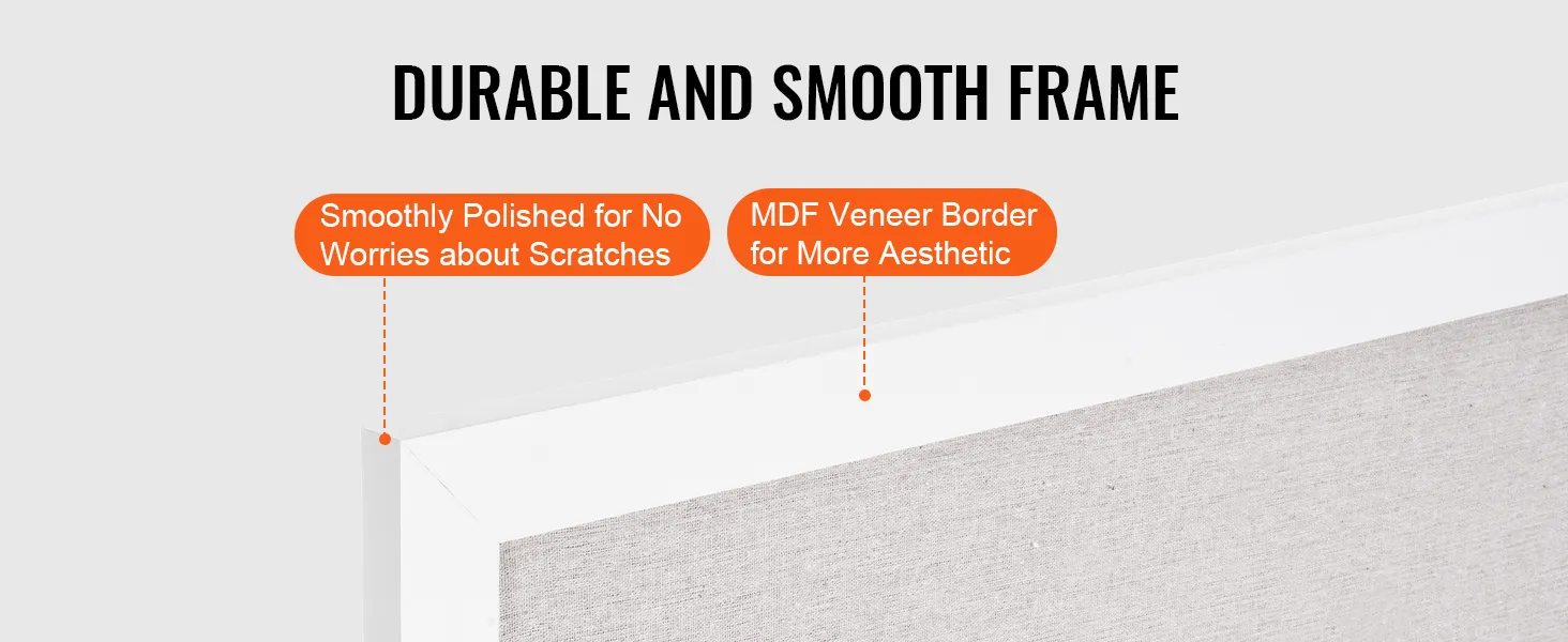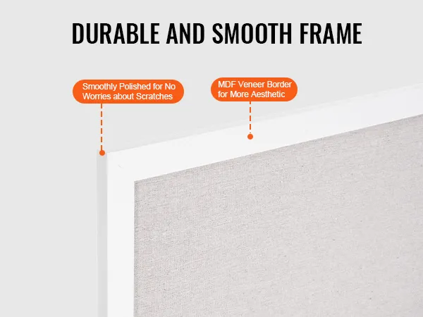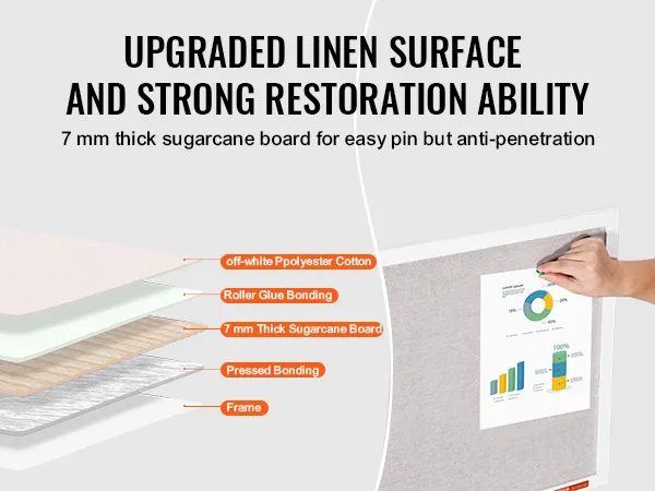 Superficie de lino mejorada: nuestro tablero de anuncios tiene una superficie de poliéster y algodón blanco con un núcleo de tablero de fibra de 7 mm de espesor. Está diseñado para resistir los antiestéticos agujeros de los alfileres incluso con un uso prolongado. La superficie está reforzada con pegamento y placas de presión, lo que evita que se abulte y garantiza una fijación segura y estable.