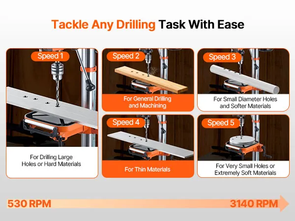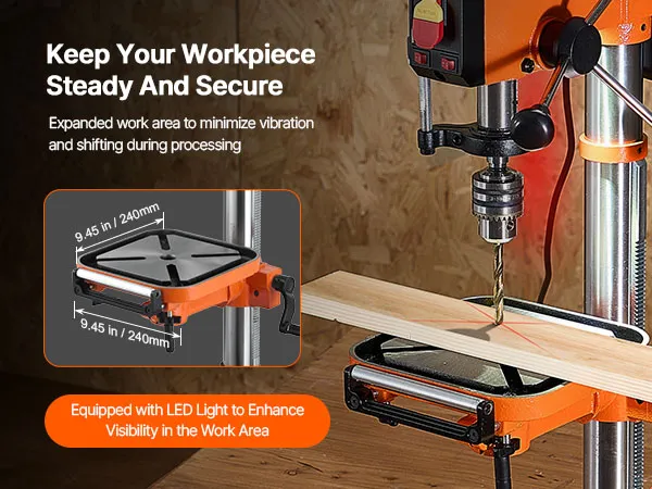 Velocidad variable: Nuestro taladro de banco cuenta con una función de control de velocidad continuamente variable, por lo que puede ajustar fácilmente la velocidad de 580 a 3200 RPM. La pantalla digital LED ayuda a controlar la velocidad con precisión.