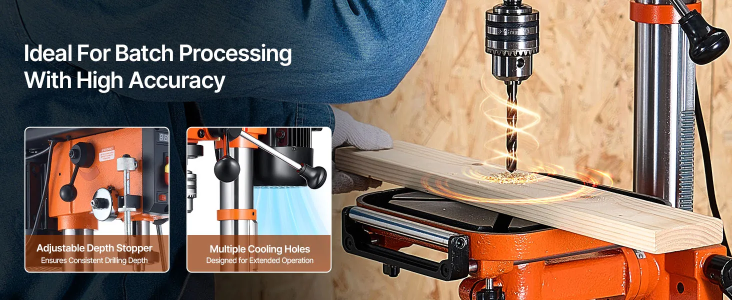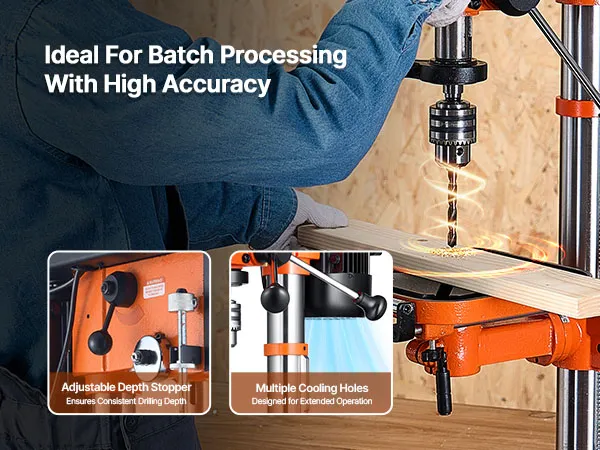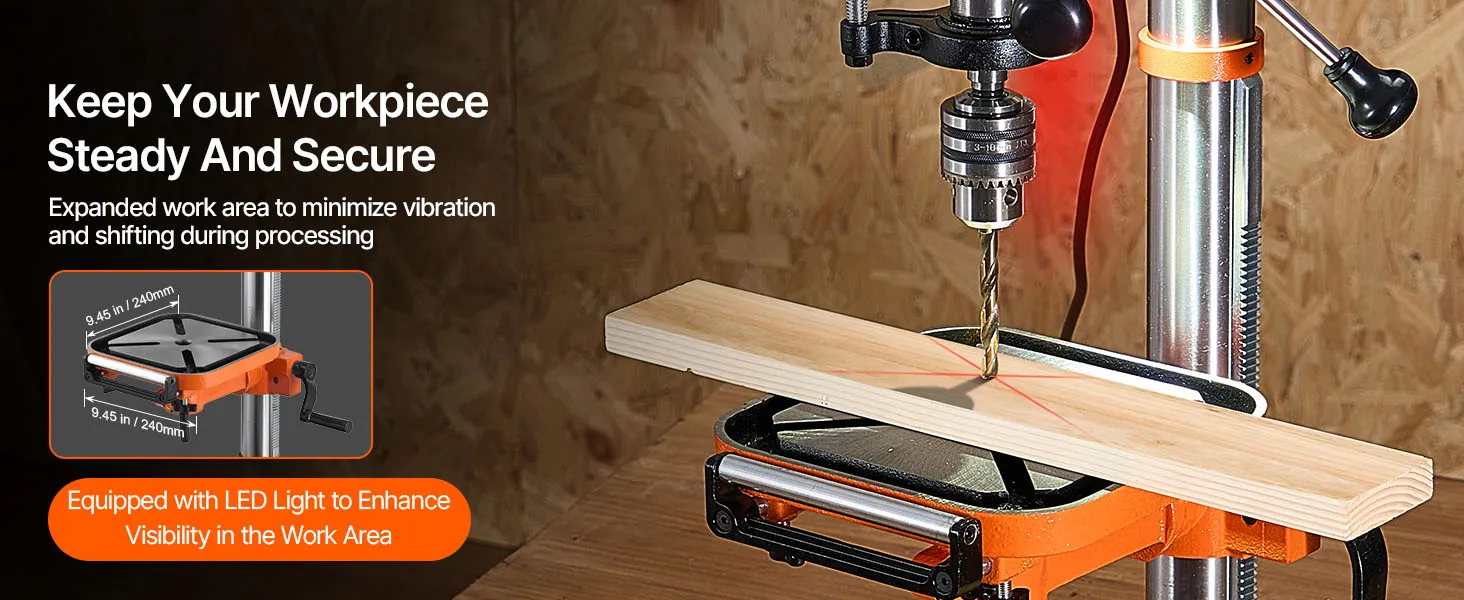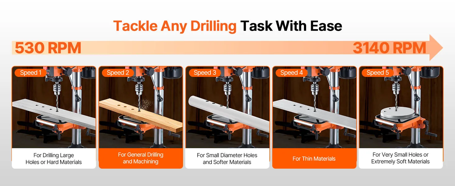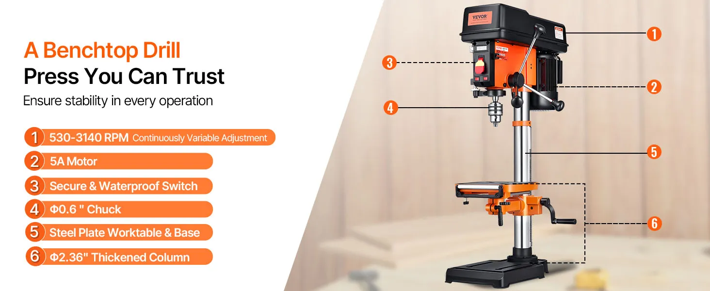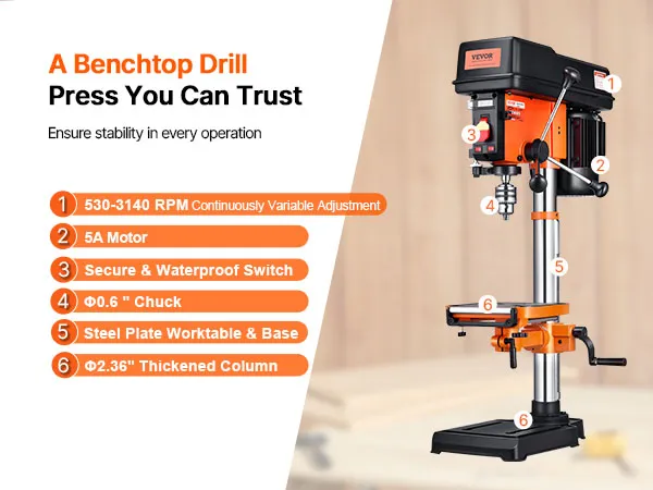 El taladro de banco VEVOR de 12 pulgadas viene con una función de control de velocidad continuamente variable y un potente motor de inducción de 5 A para brindarle potencia constante para perforar madera y metal. Perfecto para estudios y laboratorios de madera, y puede respaldar sus creaciones y mecanizado de bricolaje.