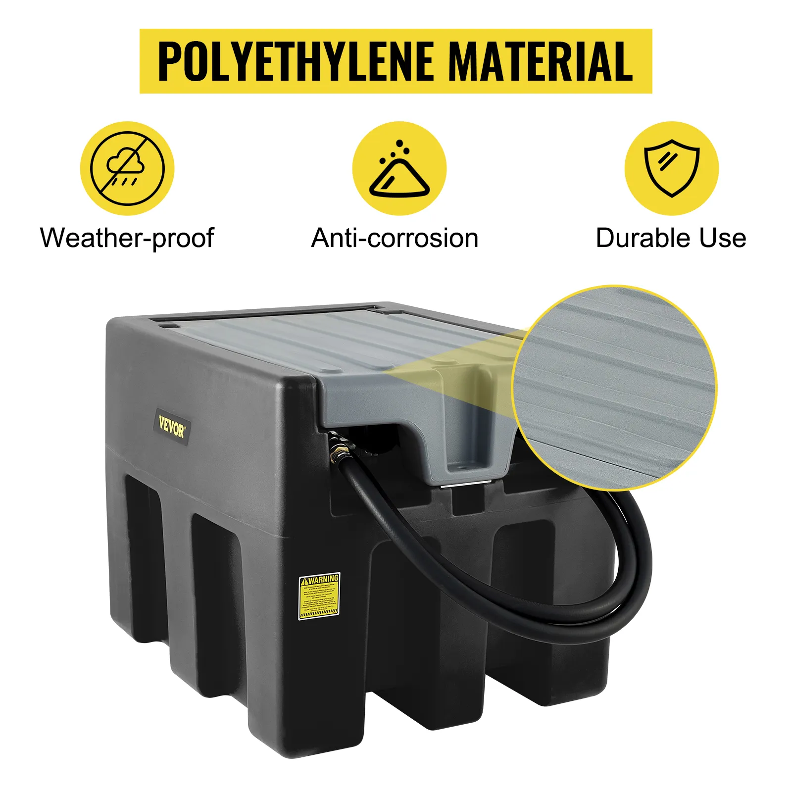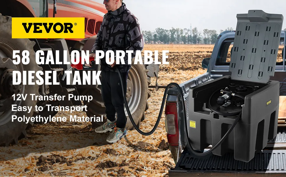 El tanque de diesel portátil de 58 galones está hecho de material de polietileno de alta calidad, que ofrece una resistencia extrema al daño mecánico y la corrosión. Dichos materiales de primera calidad respaldarán el servicio a largo plazo.