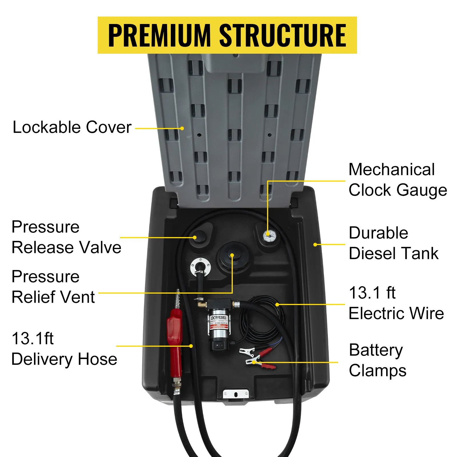 El tanque de combustible diesel tiene una estructura premium. Incluye 2 válvulas de liberación de presión, una manguera de suministro de 13,1 pies, un cable eléctrico de 13,1 pies , un indicador de reloj mecánico , una cubierta con cerradura y abrazaderas de batería. Todos estos diseños apoyarán un trabajo eficiente y seguro.
