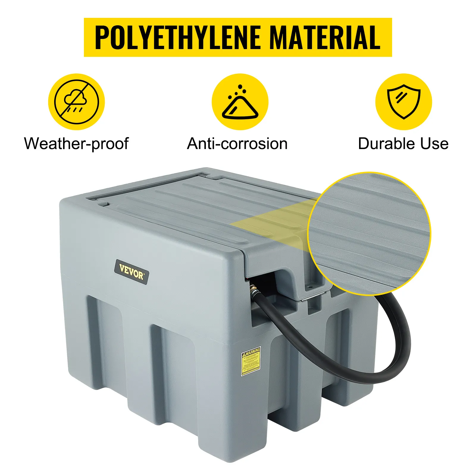 El tanque de combustible portátil VEVOR lidera la competencia con su estructura premium y construcción de polietileno de alta calidad. Este modesto tanque puede increíblemente soportar cualquier cosa que se le arroje sin corroerse ni sufrir ningún daño. Está construido de forma resistente y robusta para un servicio prolongado.