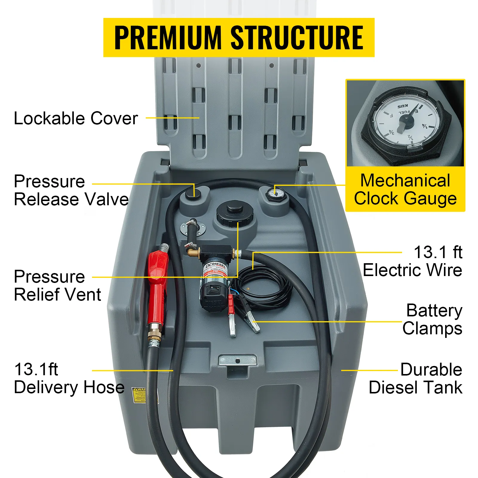 El tanque de diésel portátil VEVOR viene con características esenciales para que sea fácil y cómodo de usar. Por ejemplo, viene con dos válvulas de liberación de presión para evitar que se acumule un exceso de presión dentro del tanque portátil para un transporte seguro. Además, obtiene una manguera de suministro larga de 13,1 pies que facilita el reabastecimiento de combustible en lugares remotos. Además, el tanque de combustible diésel VEVOR tiene un indicador de reloj mecánico que indica la cantidad de diésel que aún queda para evitar escasez inesperada. ¿Mejor de todo? Hay una bomba de transferencia eléctrica de 12 V con un caudal súper rápido de 40 GPM para una transferencia de combustible más rápida y eficiente, sin perder tiempo durante el reabastecimiento de combustible.