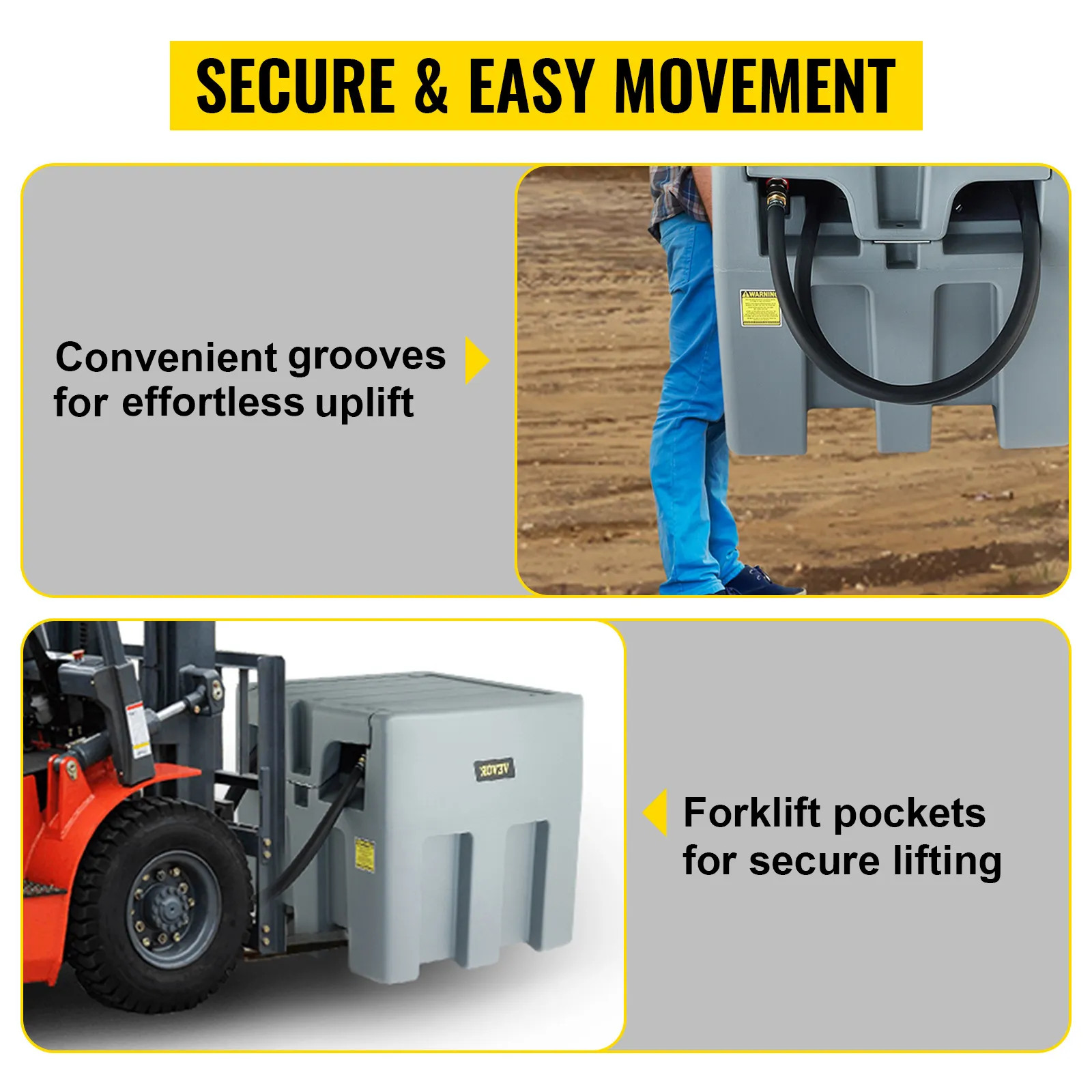 Cuando se trata de transporte de combustible fácil y seguro, puede confiar en el tanque de transferencia de diésel VEVOR. Este producto está integrado con bolsillos para montacargas que resultan útiles cuando intenta transportar un tanque lleno. Además, VEVOR incluyó una ranura para una experiencia de elevación y transporte más cómoda. Gracias a su construcción duradera, los usuarios pueden agregar ruedas a los platos para facilitar su transporte por el sitio.