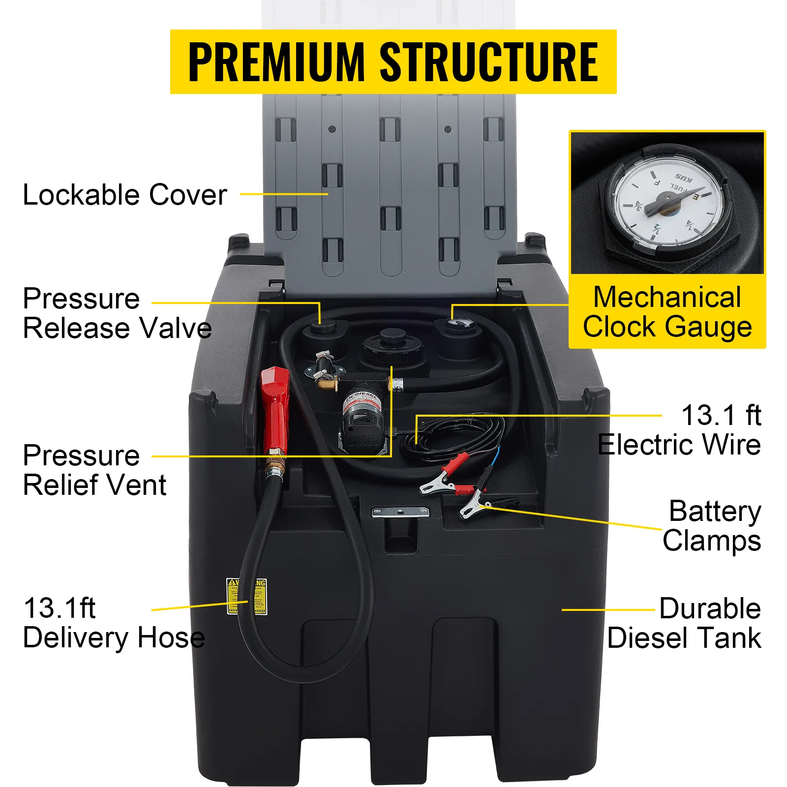 El tanque de combustible diesel tiene una estructura premium. Incluye 2 válvulas de liberación de presión, una manguera de entrega de 13,1 pies, un indicador de reloj mecánico, una tapa con cerradura, un cable eléctrico de 13,1 pies y abrazaderas de batería. Todos estos diseños apoyarán un trabajo eficiente y seguro.