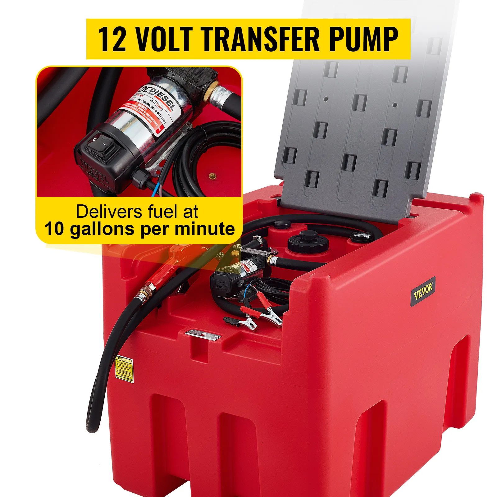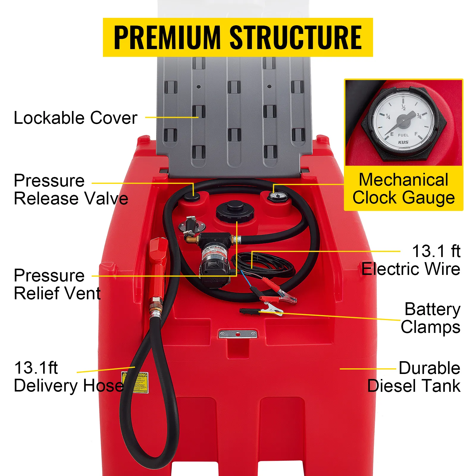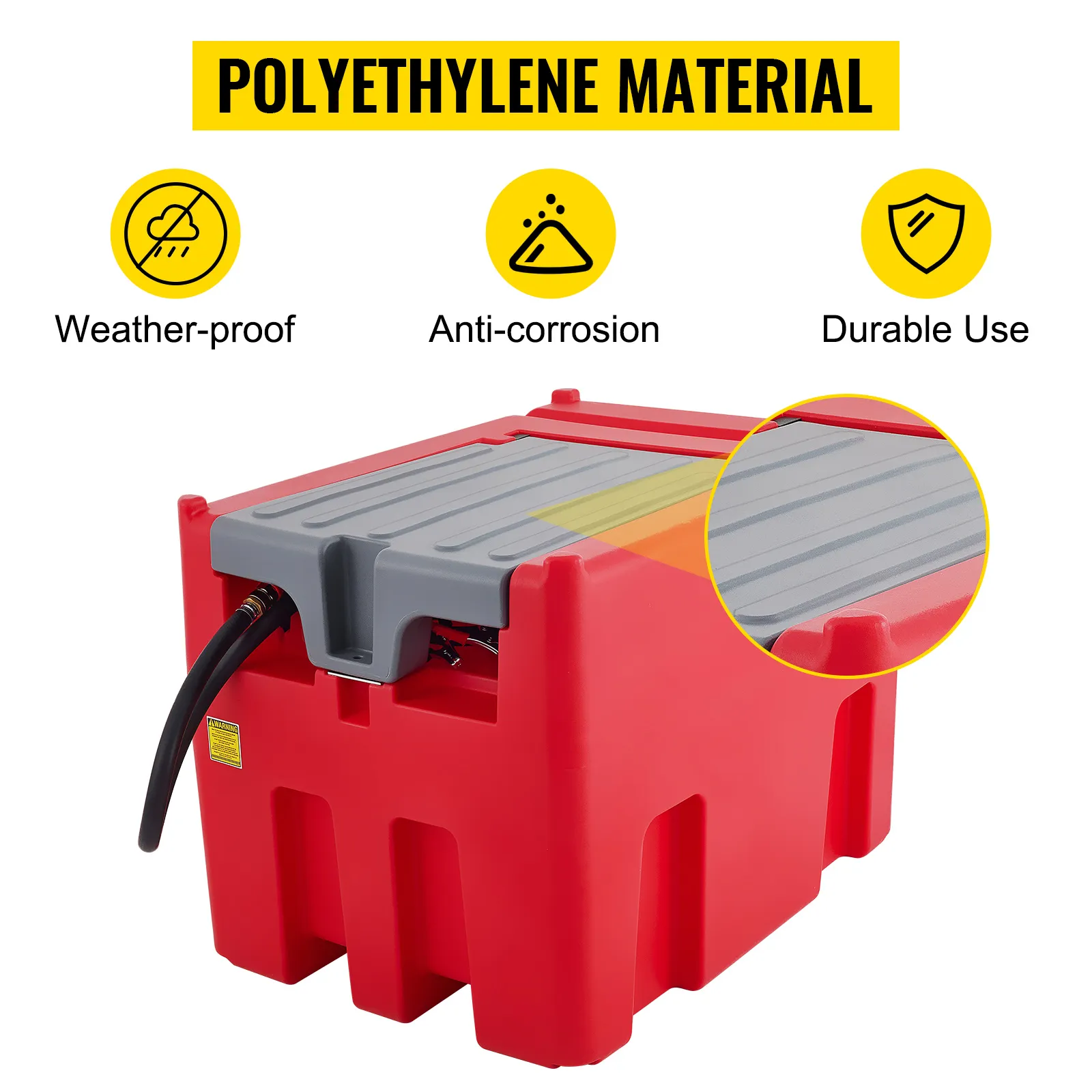 - Construido con material de polietileno, este tanque de diésel portátil es duradero y garantiza una larga vida útil. Diseñado con huecos para montacargas y ranuras, puede mover el tanque de manera rápida y segura. Además, la bomba de transferencia de 12 V entregará combustible a 10 galones por minuto, brindando la mejor manera de recargar fácilmente mientras protege sus activos del combustible contaminado. En resumen, es un excelente tanque de combustible que puede brindarle mucha comodidad.