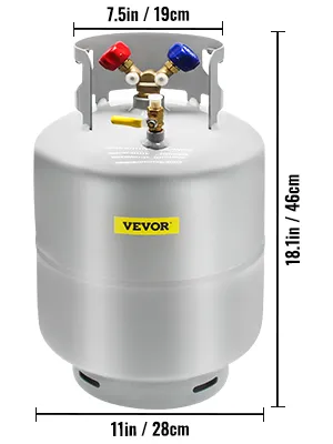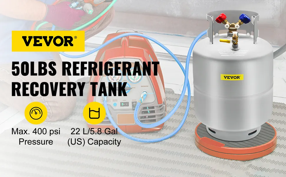 Tanque de recuperación de refrigerante de 50 libras: Capacidad: 50 libras; Volumen: 5,8 gal (EE. UU.)/22 l; máx. presión de trabajo: 400 psi; Temperatura de trabajo: -60 ℃ -20 ℃.