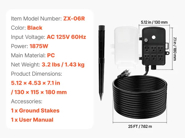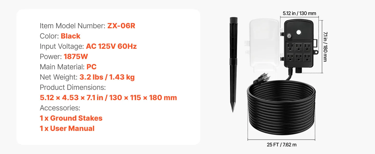 Estaca de enchufes para exteriores VEVOR, cable de extensión de 7,6 m, resistente a la intemperie, con cubierta y protección contra sobrecargas, 6 tomas de corriente, 15 A/1875 W, estaca de jardín multitoma impermeable para luces navideñas