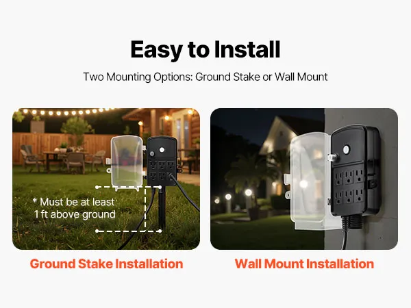 Instálalo a tu gusto. Clávalo en el suelo (al menos a 30 cm del suelo) o móntalo en la pared. Nuestro enchufe múltiple para exteriores, resistente al agua, es fácil de instalar y fiable para diferentes entornos exteriores.