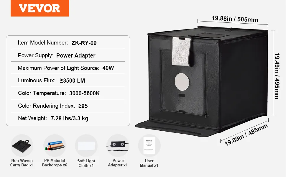 Caja de luz para estudio fotográfico VEVOR, 50 x 50 cm, 3000-5600 K, 3 temperaturas de color ajustables, kit de carpa para fotografía con 160 LED, 6 fondos, adaptador de corriente, tela suave, alto CRI ≥ 95 para fotografía de productos.
