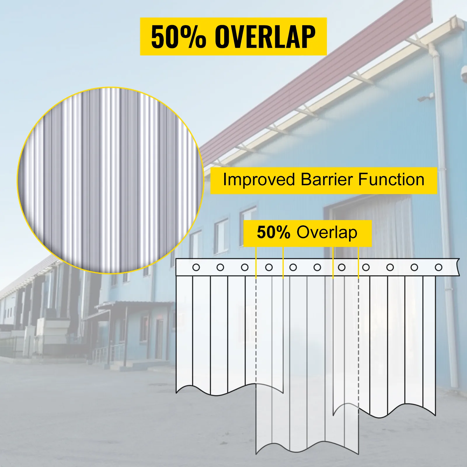 La superposición de nuestra cortina de tiras para puertas es del 50 %, lo que puede proporcionar un mejor rendimiento para bloquear el viento y el aire frío. Además, las tiras se pueden recortar si son demasiado largas para su puerta.