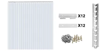 - Nota: Cuando esté instalado, habrá una superposición de aproximadamente 1,97 in/5 cm entre una tira y otra. El ancho total de la cortina de 12 tiras instalada es de 1,21 m/4 pies y se necesitan dos soportes (longitud de cada uno: 0,6 m/2 pies).