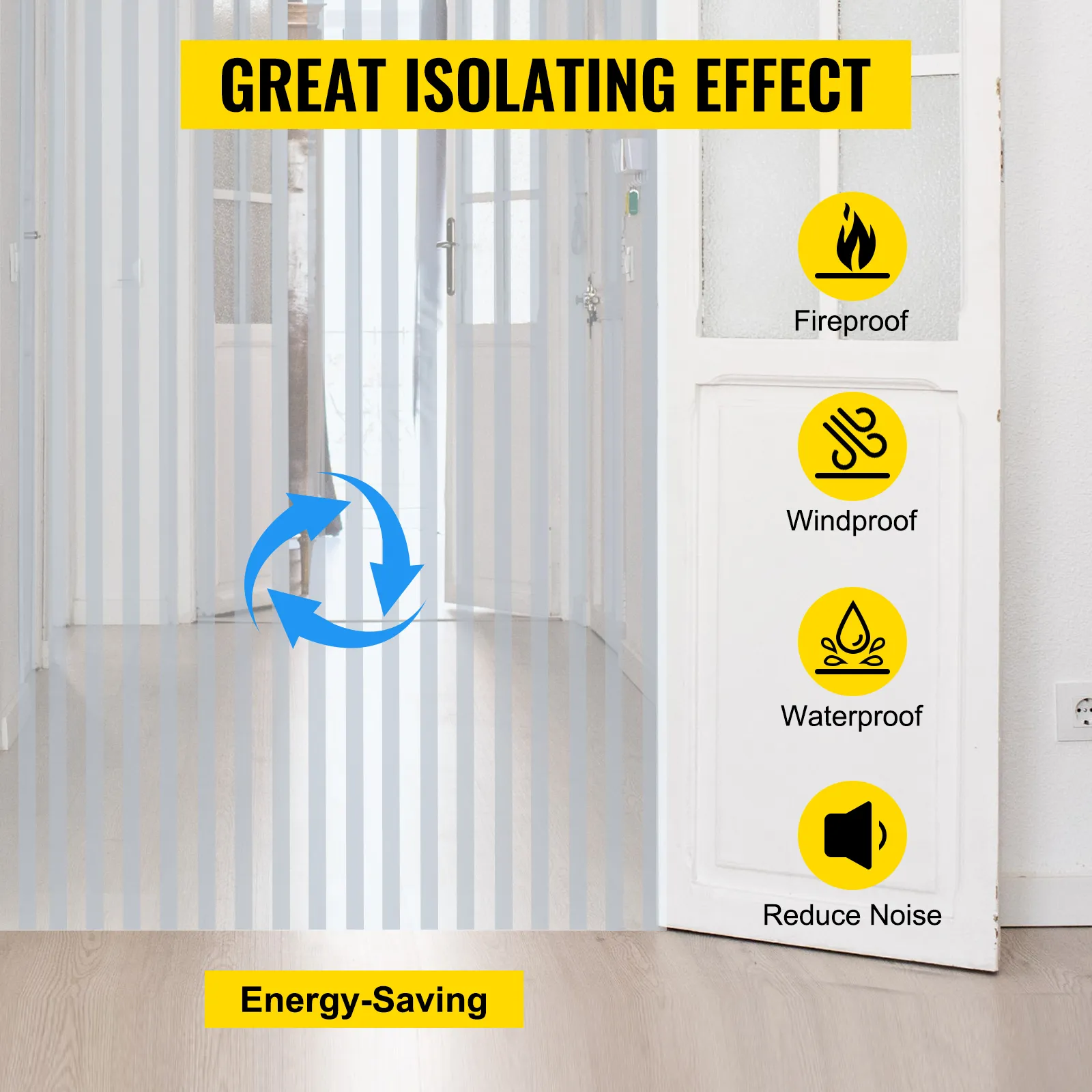 Esta cortina de tiras de plástico tiene una gran capacidad ignífuga y un buen aislamiento acústico. Como resultado, es lo suficientemente poderoso contra el viento, la lluvia y el fuego. También mantiene las plagas, los insectos y el polvo fuera.