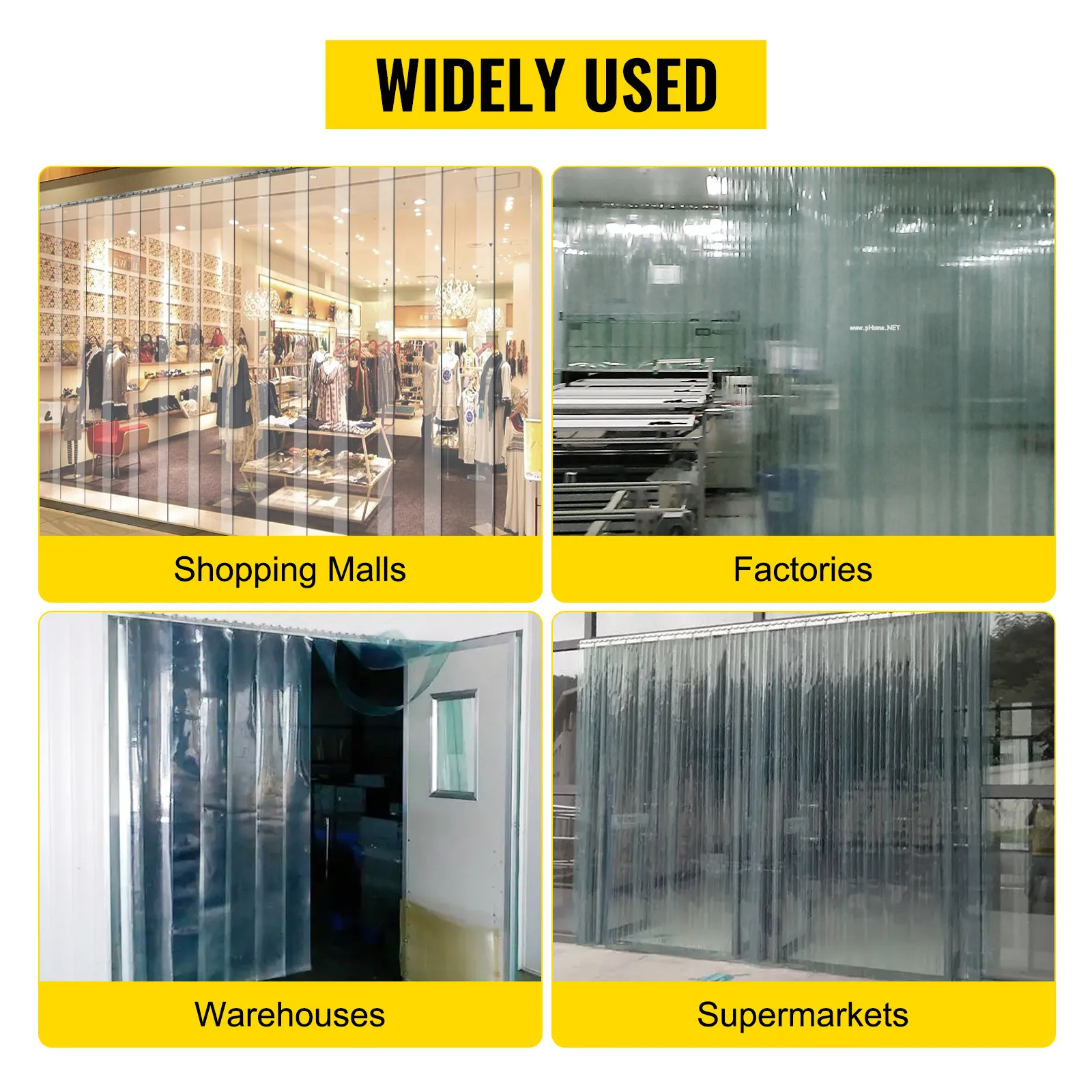 - Nuestras tiras de cortina están construidas con material de PVC; ¡pueden reducir el ruido, mantener el interior cálido y mantener sus espacios alejados de la contaminación y las plagas! El diseño casi transparente facilita la entrada y salida de personas. En lugar de instalar múltiples paredes y puertas, nuestras cortinas de tiras pueden mantener su espacio claramente protegido. Es perfecto para usar en fábricas, tiendas, centros comerciales y otros lugares.