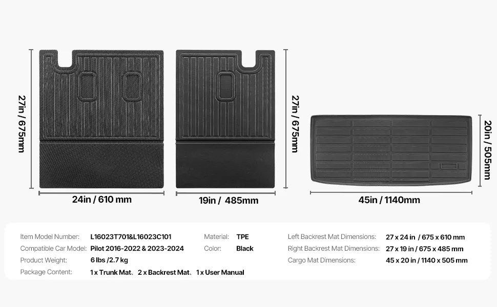 Nuestra alfombrilla de carga personalizada con alfombrilla para el respaldo es compatible con los modelos Honda Pilot 2016-2022 y 2023-2024. Con un moldeado preciso mediante escaneo láser 3D, una fácil instalación con velcro y material TPE para todo tipo de climas, garantiza un ajuste perfecto y mantiene el interior de su automóvil limpio e impecable.