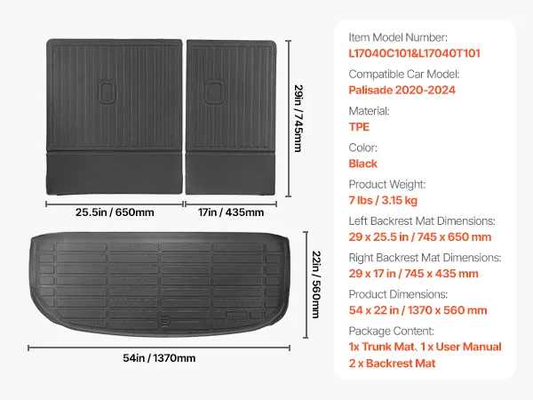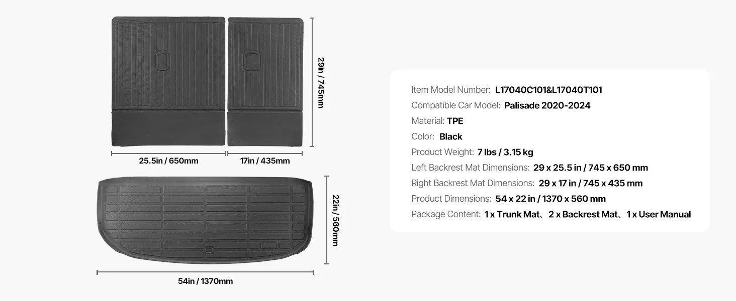 Custom Fit: Compatible with 2020-2024 Hyundai Palisade models, this cargo mat and backrest mat set uses advanced 3D technology to precisely capture the vehicle’s data, ensuring a flawless fit. Not only does the cargo linear add a little touch of style to your car, but elevates its overall interior appeal.