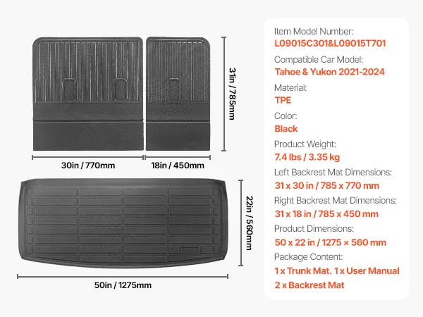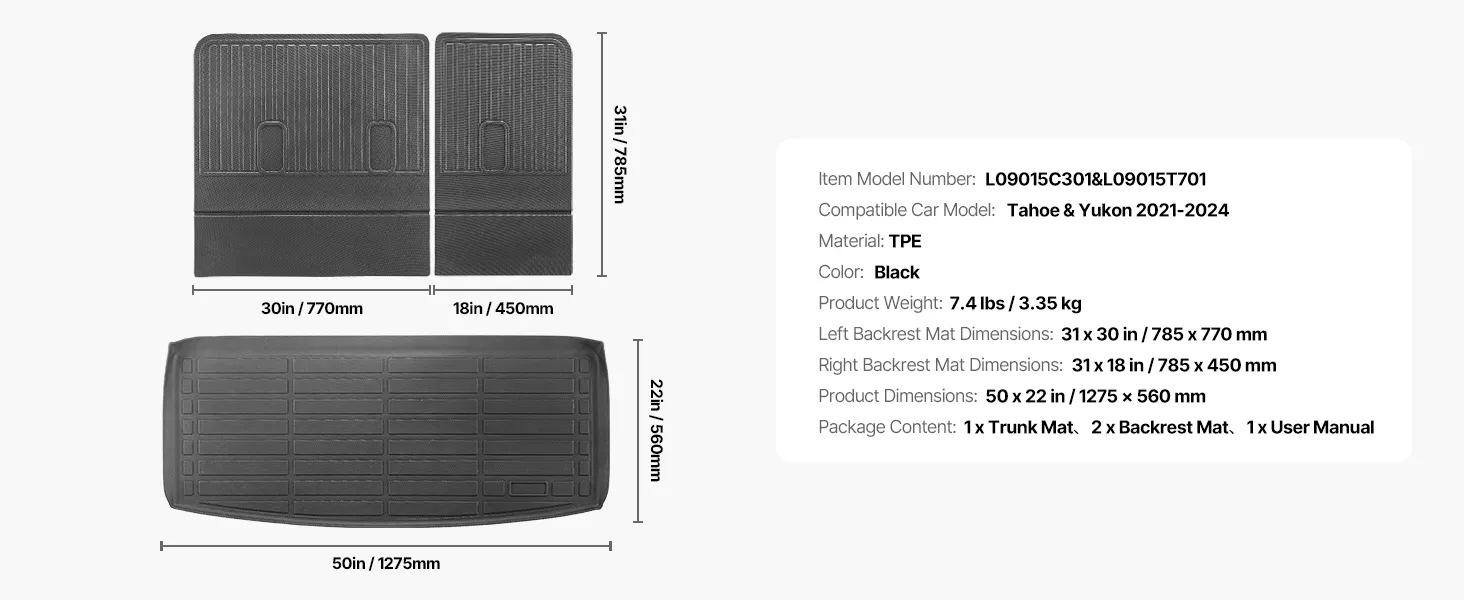 Custom Fit: Compatible with 2021-2024 Chevy Tahoe & GMC Yukon models, this cargo mat and backrest mat set uses advanced 3D technology to precisely capture the vehicle’s data, ensuring a flawless fit. Not only does the cargo liner add a little touch of style to your car, but elevates its overall interior appeal.