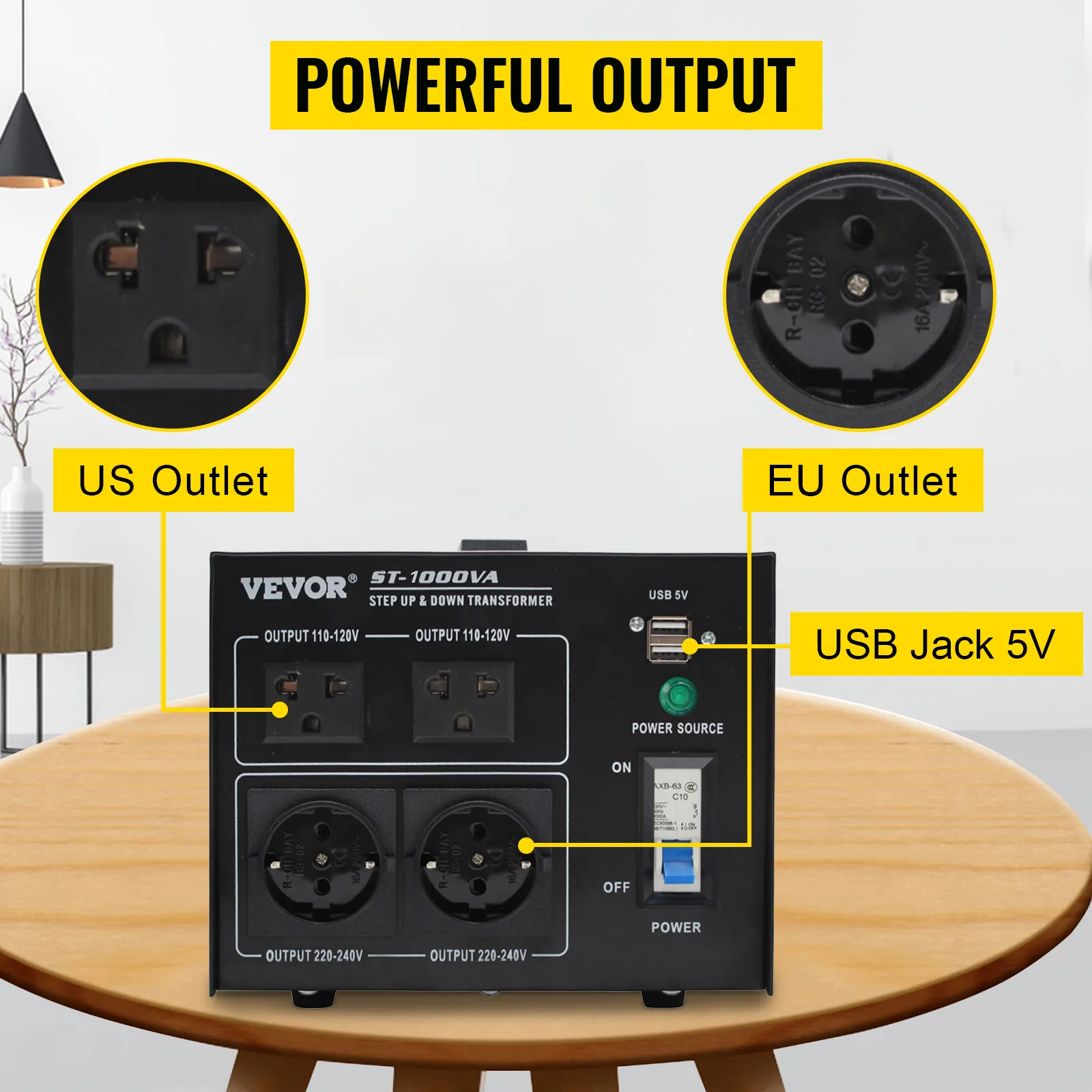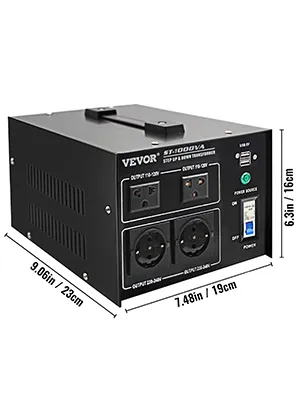 Este transformador reductor admite hasta 1000 VA en múltiples dispositivos simultáneamente. Puede convertir voltaje de 220-240 voltios a 110-120 voltios y viceversa.