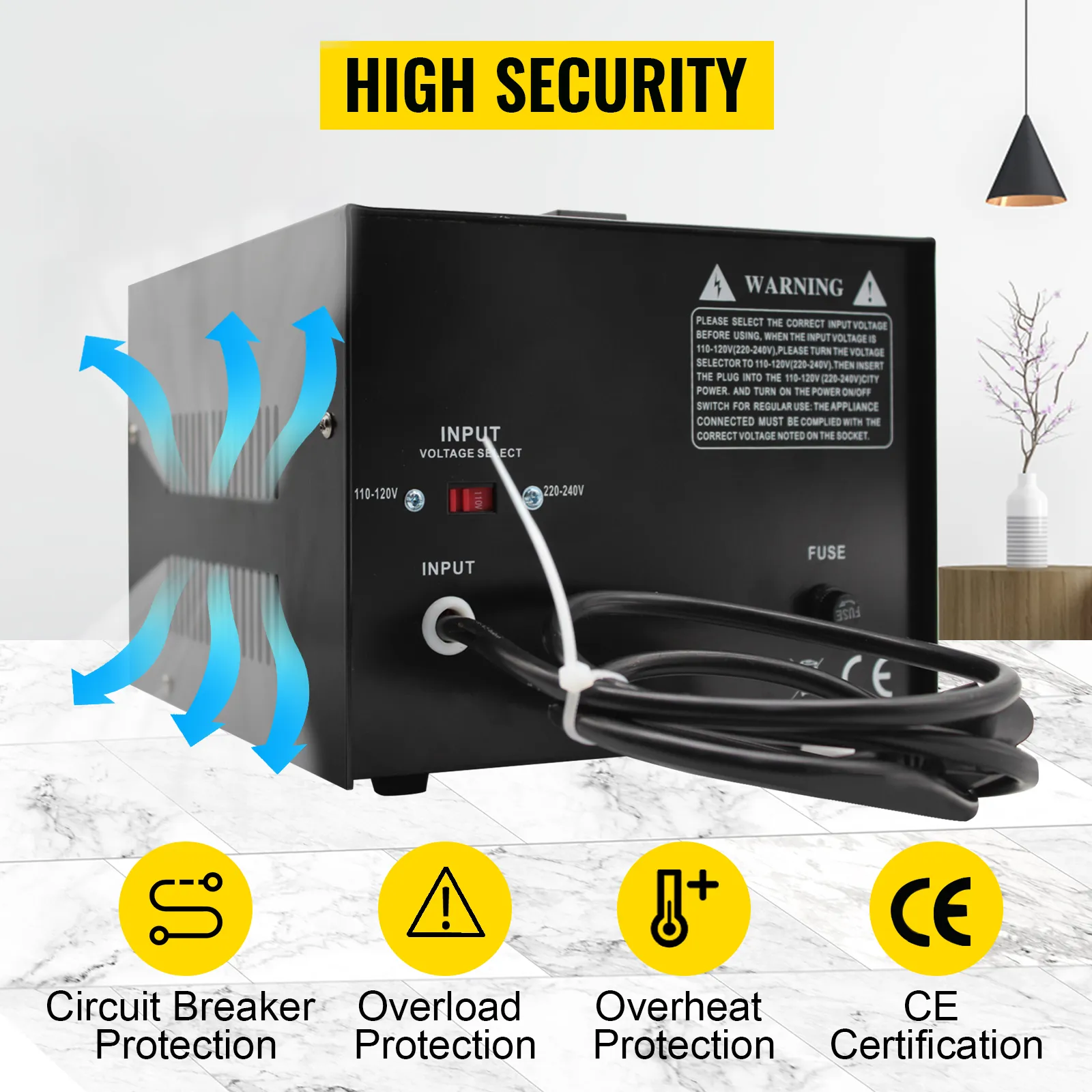 El convertidor de voltaje reductor reductor está equipado con un disyuntor, protección contra sobrecarga, protección contra sobrecalentamiento y certificación CE, lo que hace que los usuarios estén más seguros durante el uso.