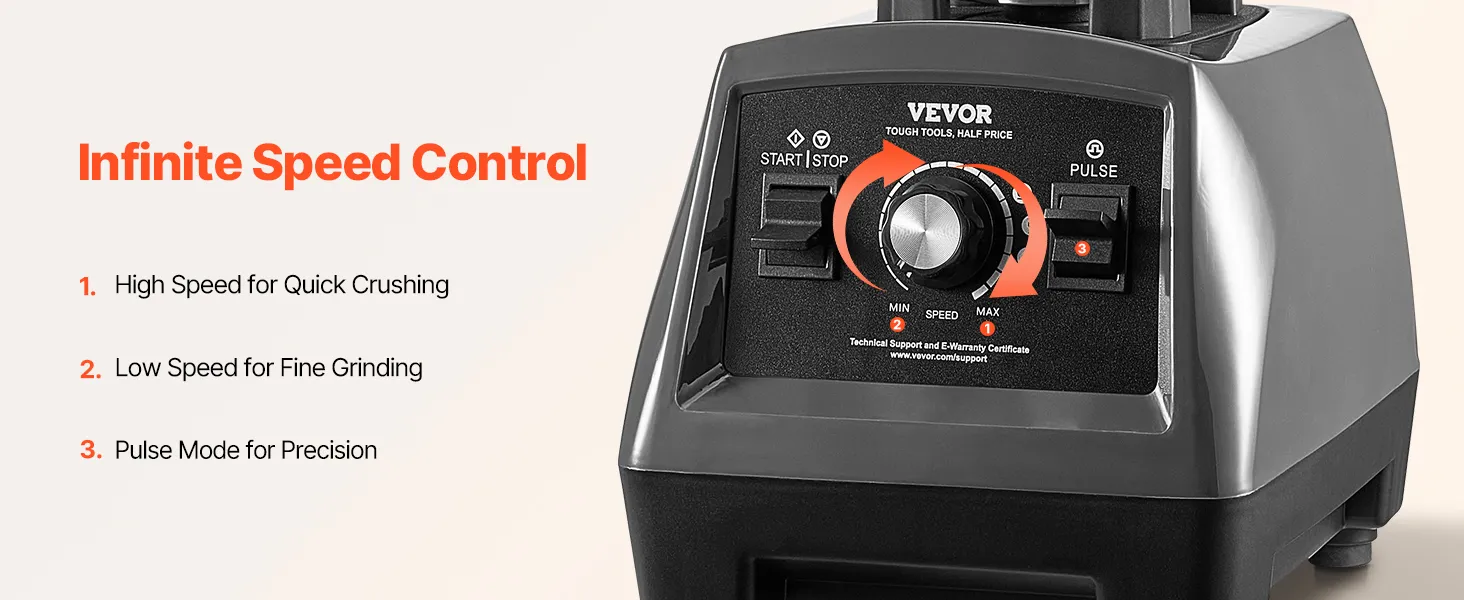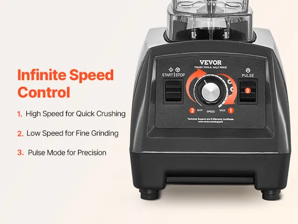 Esta licuadora cuenta con tres menús preestablecidos y una perilla de velocidad infinitamente ajustable. El modo de alta velocidad tritura rápidamente los ingredientes. El modo de baja velocidad permite una molienda fina y el modo de pulso proporciona un control manual.