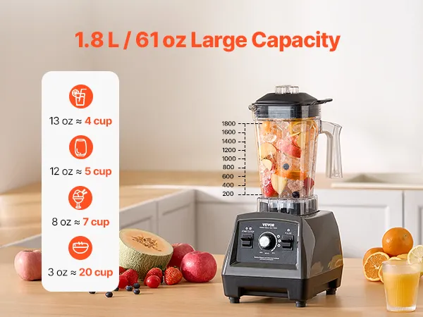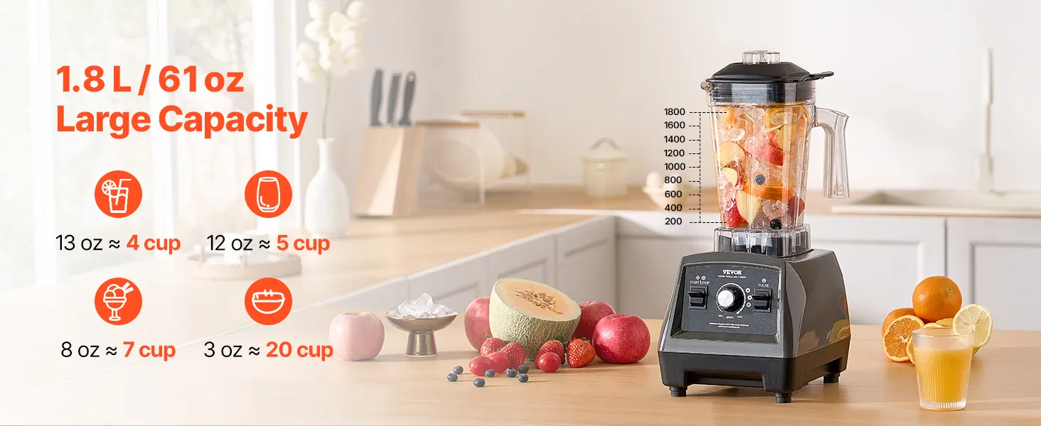 La licuadora de 1,8 L/61 oz tiene un motor de alta velocidad de 1400 W. Esta potente licuadora tritura rápidamente el hielo y lo convierte en un granizado suave y fino, ideal para preparar bebidas frías como batidos y granizados. Fácil de usar, segura y confiable.