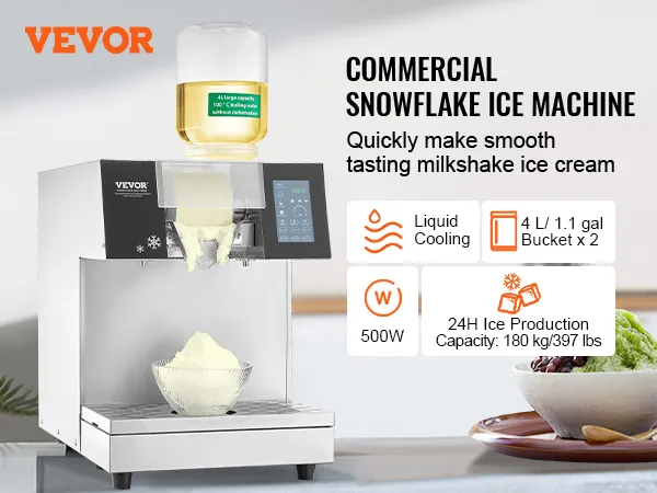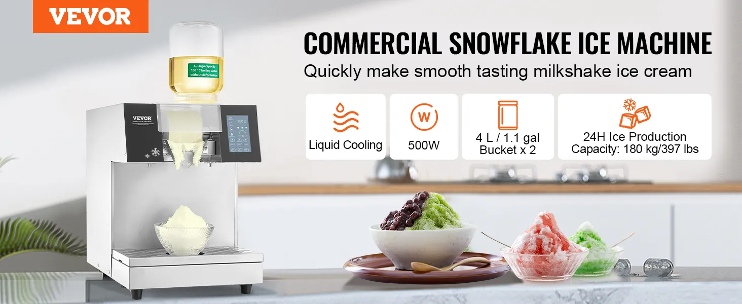 Máquina de hielo en copos VEVOR comercial, capacidad de 180 kg/24 h, máquina de hielo raspado de acero inoxidable, máquina eléctrica para conos de nieve, sistema de refrigeración líquida para una rápida disipación del calor, helado