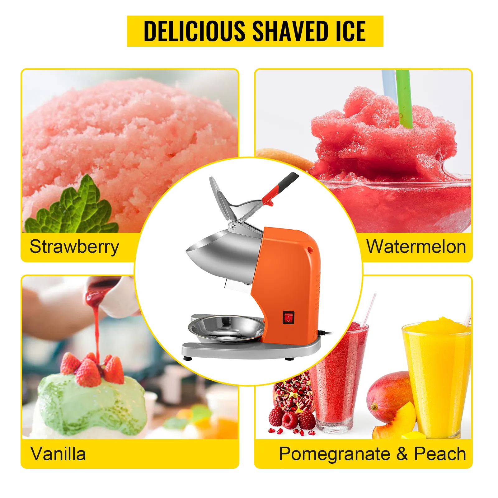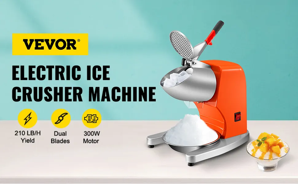 Nuestra máquina para hacer hielo eléctrica presenta una apariencia agradable a la vista y un rendimiento potente. Con el motor de cobre integrado de 300 W, puede triturar 210 lbs (95 kg) de hielo cada hora, brindándole hielo de nieve suave, esponjoso y en polvo y satisfaciendo sus demandas en un tiempo relativamente corto. También se integran detalles de diseño y accesorios considerados, como el práctico recipiente para hielo, la salida de hielo a prueba de salpicaduras, el mango ergonómico, la base en forma de U con pies antideslizantes, las salidas de aire densas, etc. Es perfecto para restaurantes, cantinas, bares, cafés, puestos de comida, etc.