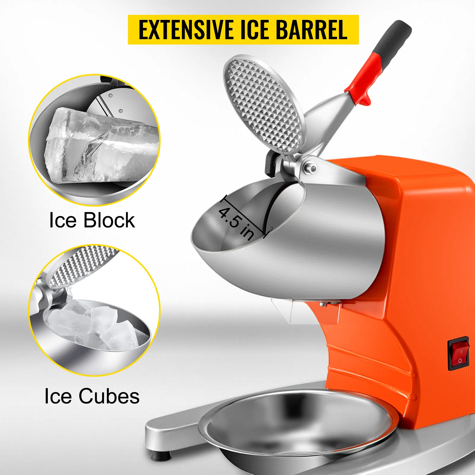 Esta máquina para hacer hielo eléctrica cuenta con un cilindro de entrada de hielo extenso y un orificio de entrada de hielo ancho, cuyo diámetro mide 11,5 cm (4,5"). Puede colocar cubitos de hielo pequeños o bloques de hielo grandes. Cuanto más hielo cargue en cada momento, más más hielo picado obtendrá en consecuencia.
