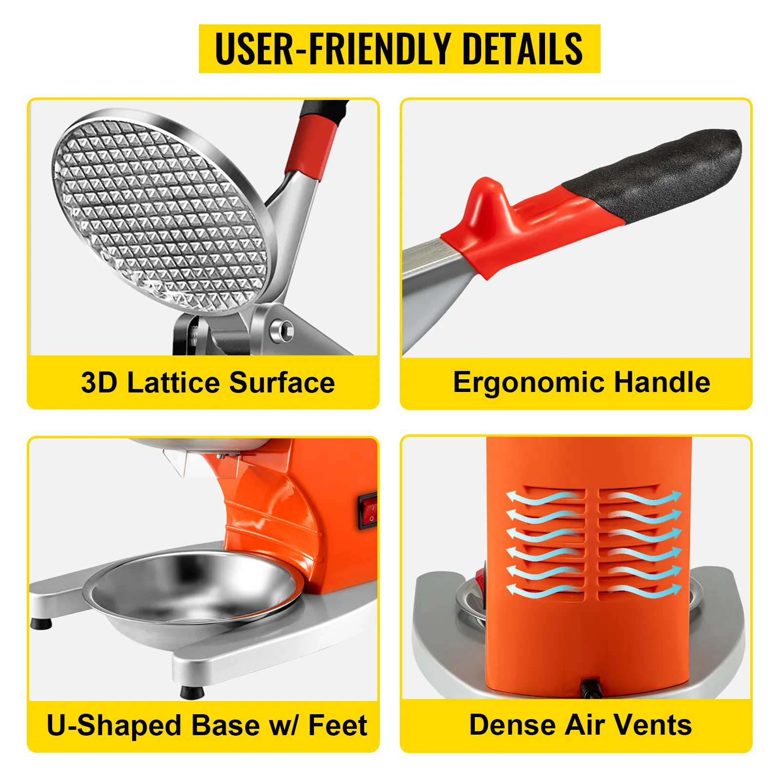 El disco se ajusta perfectamente a la entrada de hielo, evitando eficazmente que salpiquen trozos de hielo. Una funda antideslizante está envuelta en el extremo del mango que ahorra mano de obra. La base en forma de U con pies de goma puede mejorar la estabilidad de la máquina. Y las ventilaciones de aire densas para la disipación de calor son para extender la vida útil del motor.