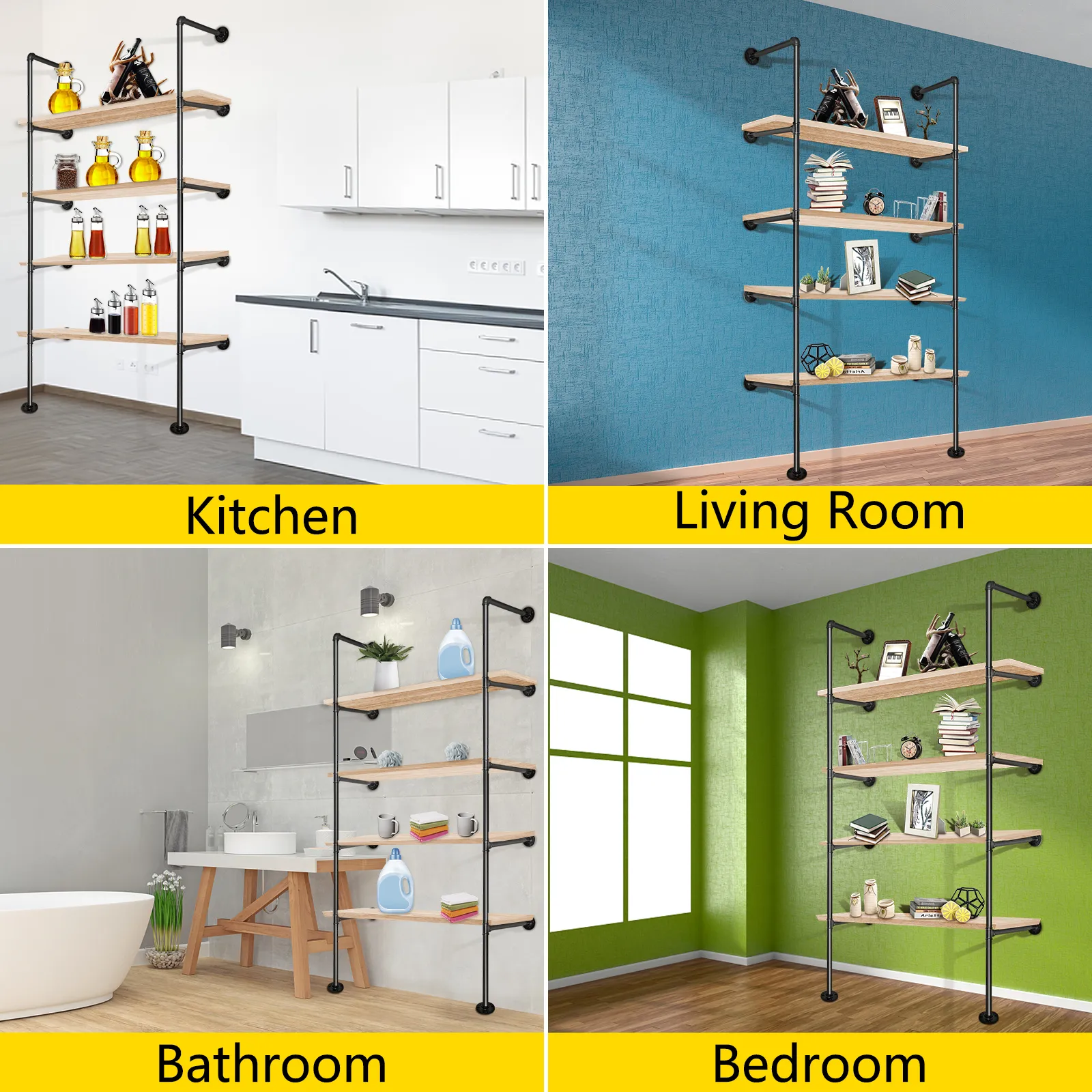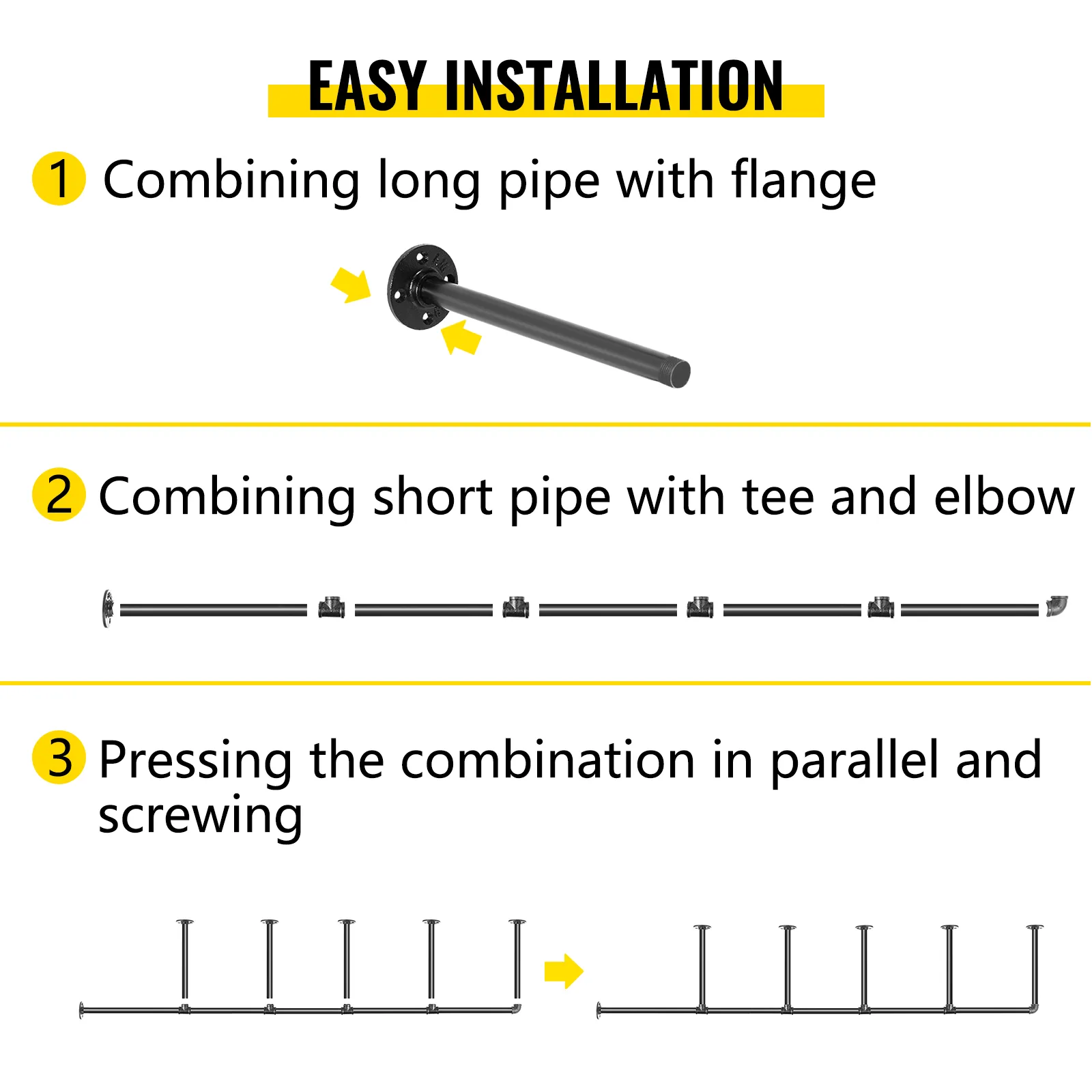 Con un proceso de recubrimiento en polvo, los estantes para tuberías están fabricados con hierro inoxidable y sólido como una roca. Es conveniente armar los estantes multicapa con codos, tes, bridas, abrazaderas y tornillos. Puede usarlo para hacer bricolaje en su estantería, estante de cocina, estante de baño, estante de flores.