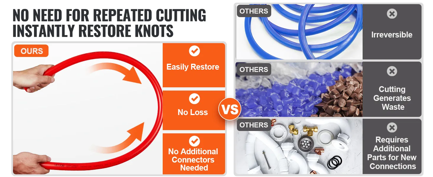 VEVOR's PEX-A pipe exhibits outstanding resilience. Even if the pipe gets twisted, simply heat the twisted section with a heat gun, let it cool, and it will return to its original shape. No cutting, no loss of pipe material, and no additional fittings required, all while saving time.