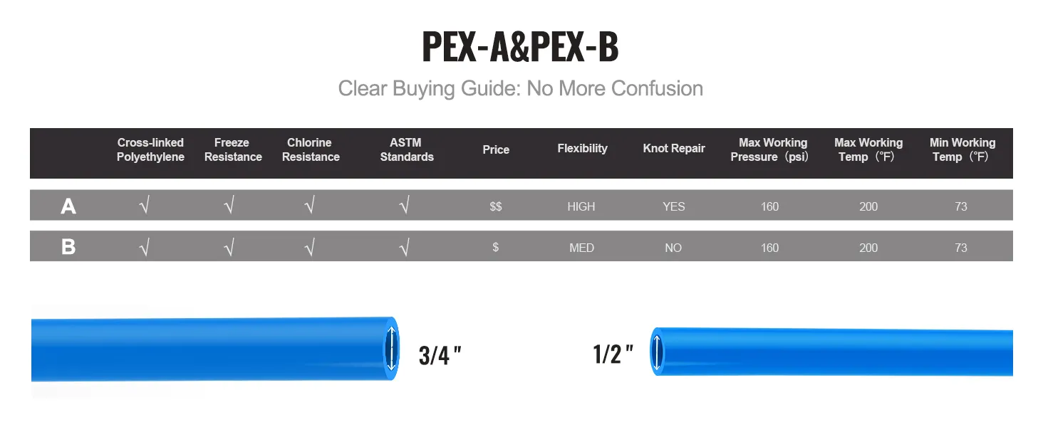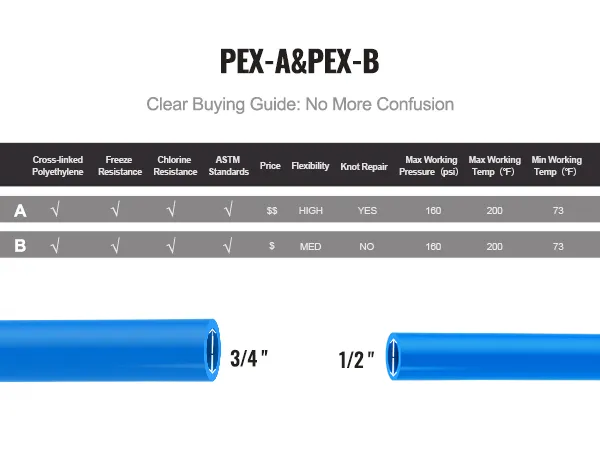 PEX-A pipe and PEX-B pipe are different, with noticeable distinctions in price, flexibility, and kink repair. You can choose the appropriate pipe based on your specific needs, and VEVOR can provide it for you.