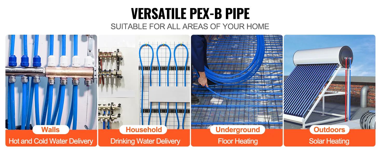 Compatible with Common Fittings: PEX-B pipe can be used with various fittings, including expansion rings, couplings, elbows, tees, push-to-connect fittings, and more (products not included, available for purchase separately). It is widely used in both residential and commercial cold and hot water supply systems, radiant floor heating, solar heating, and more.
