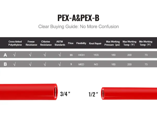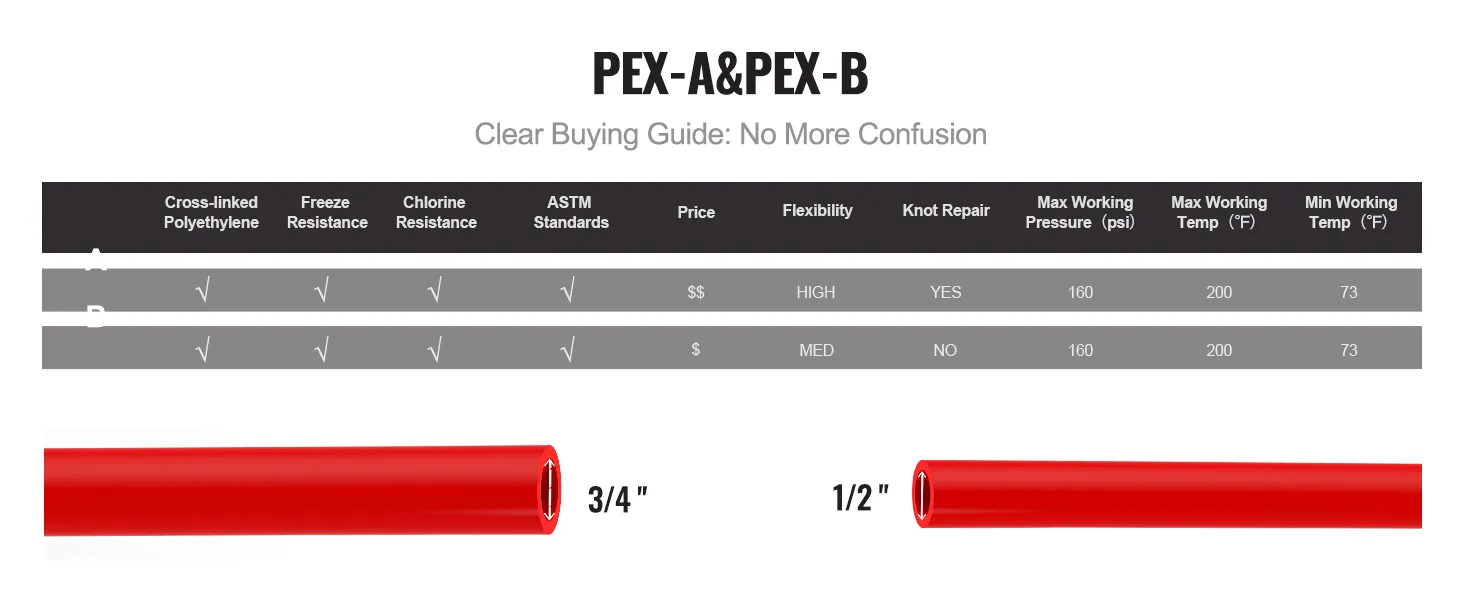 PEX-A pipe and PEX-B pipe are different, with noticeable distinctions in price, flexibility, and kink repair. You can choose the appropriate pipe based on your specific needs, and VEVOR can provide it for you.