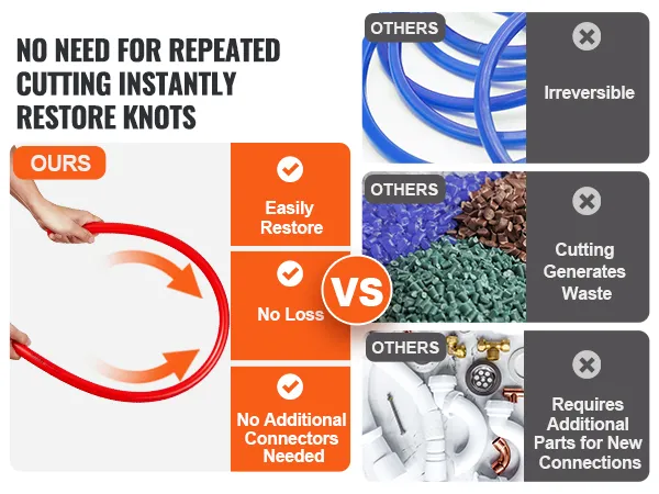 VEVOR's PEX-A pipe exhibits outstanding resilience. Even if the pipe gets twisted, simply heat the twisted section with a heat gun, let it cool, and it will return to its original shape. No cutting, no loss of pipe material, and no additional fittings required, all while saving time.