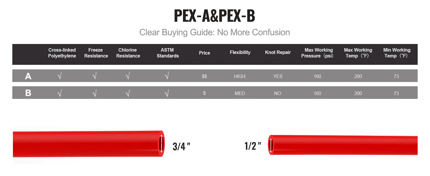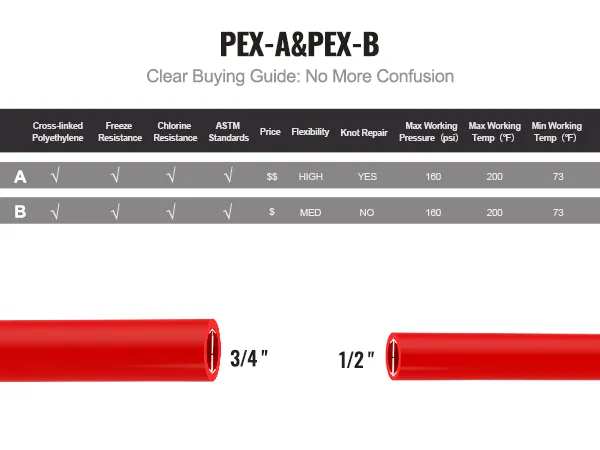 Las tuberías PEX-A y PEX-B son diferentes, con distinciones notables en precio, flexibilidad y reparación de torceduras. Puede elegir la tubería adecuada según sus necesidades específicas y VEVOR puede proporcionársela.
