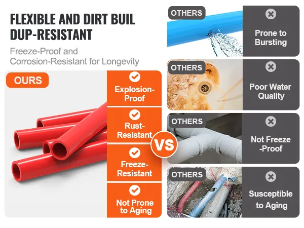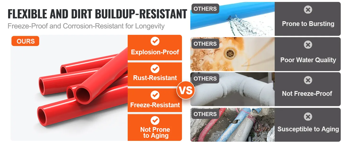 La tubería PEX-B de VEVOR presenta una pared interior lisa que resiste la acumulación de suciedad y ofrece un rendimiento excepcional en términos de resistencia a explosiones, resistencia a la oxidación, resistencia al congelamiento y resistencia al envejecimiento, superando a las tuberías comunes de baja calidad.
