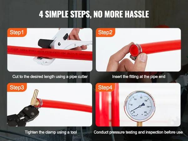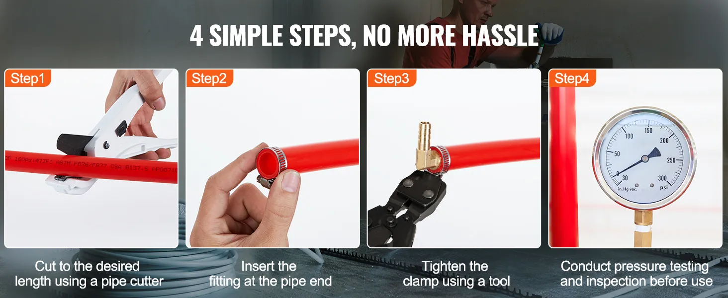 ¡Diga adiós al engorroso corte de tuberías! Nuestra tubería PEX-B viene con un cortatubos exclusivo que garantiza cortes limpios sin ningún riesgo para sus manos. La instalación requiere solo 4 sencillos pasos y, cuando se utiliza con las abrazaderas incluidas, aumenta significativamente la eficiencia del trabajo.