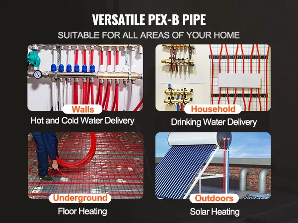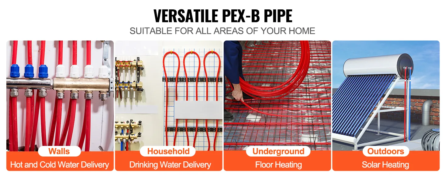 Compatible con accesorios comunes: la tubería PEX-B se puede usar con varios accesorios, incluidos anillos de expansión, acoplamientos, codos, tes, accesorios de conexión a presión y más (productos no incluidos, disponibles para comprar por separado). Es ampliamente utilizado en sistemas de suministro de agua fría y caliente tanto residenciales como comerciales, calefacción por suelo radiante, calefacción solar y más.