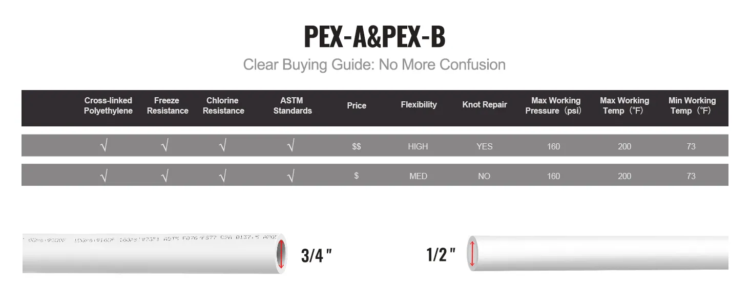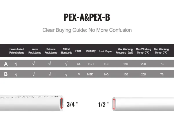 PEX-A pipe and PEX-B pipe are different, with noticeable distinctions in price, flexibility, and kink repair. You can choose the appropriate pipe based on your specific needs, and VEVOR can provide it for you.
