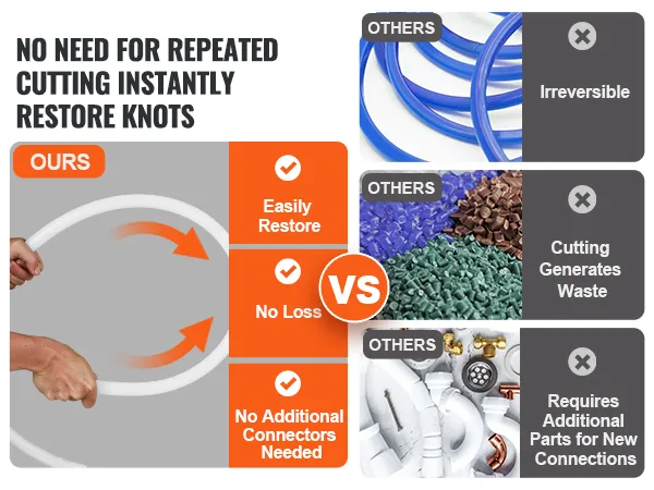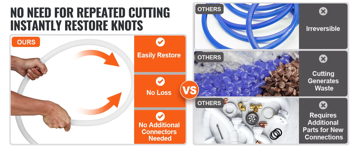 VEVOR's PEX-A pipe exhibits outstanding resilience. Even if the pipe gets twisted, simply heat the twisted section with a heat gun, let it cool, and it will return to its original shape. No cutting, no loss of pipe material, and no additional fittings required, all while saving time.